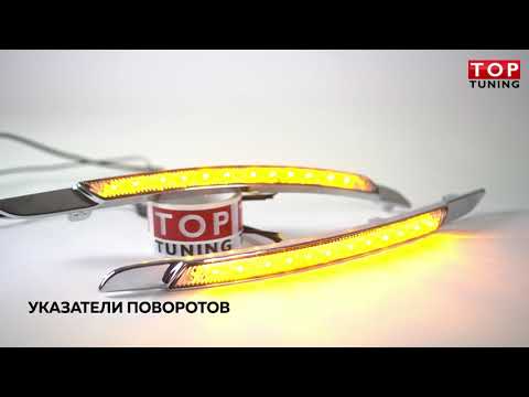 Ходовые огни устанавливаются взамен штатных молдингов переднего бампера в заводские посадочные места. Внутри каждого ходового огня расположены 24 сверхярких светодиода белого и оранжевого цвета. Ходовые огни настроены на функцию теплого "плавного" включения. Профессиональная установка в тех центре Топ Тюнинг (Москва) по предварительной записи.