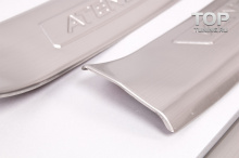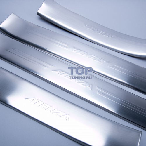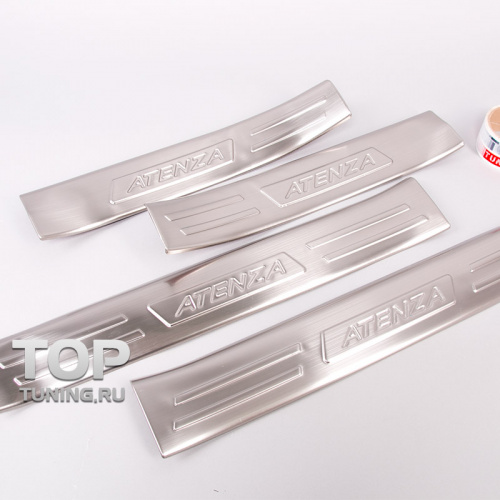 Установка на двустронний скотч (в комплекте). Элементы модели "Атенза" имеют развитые бортики, защищающие углы пластикового порога изнутри и снаружи. В наборе: две передних накладки + две задних. Детали выполены из нержавеющей стали.