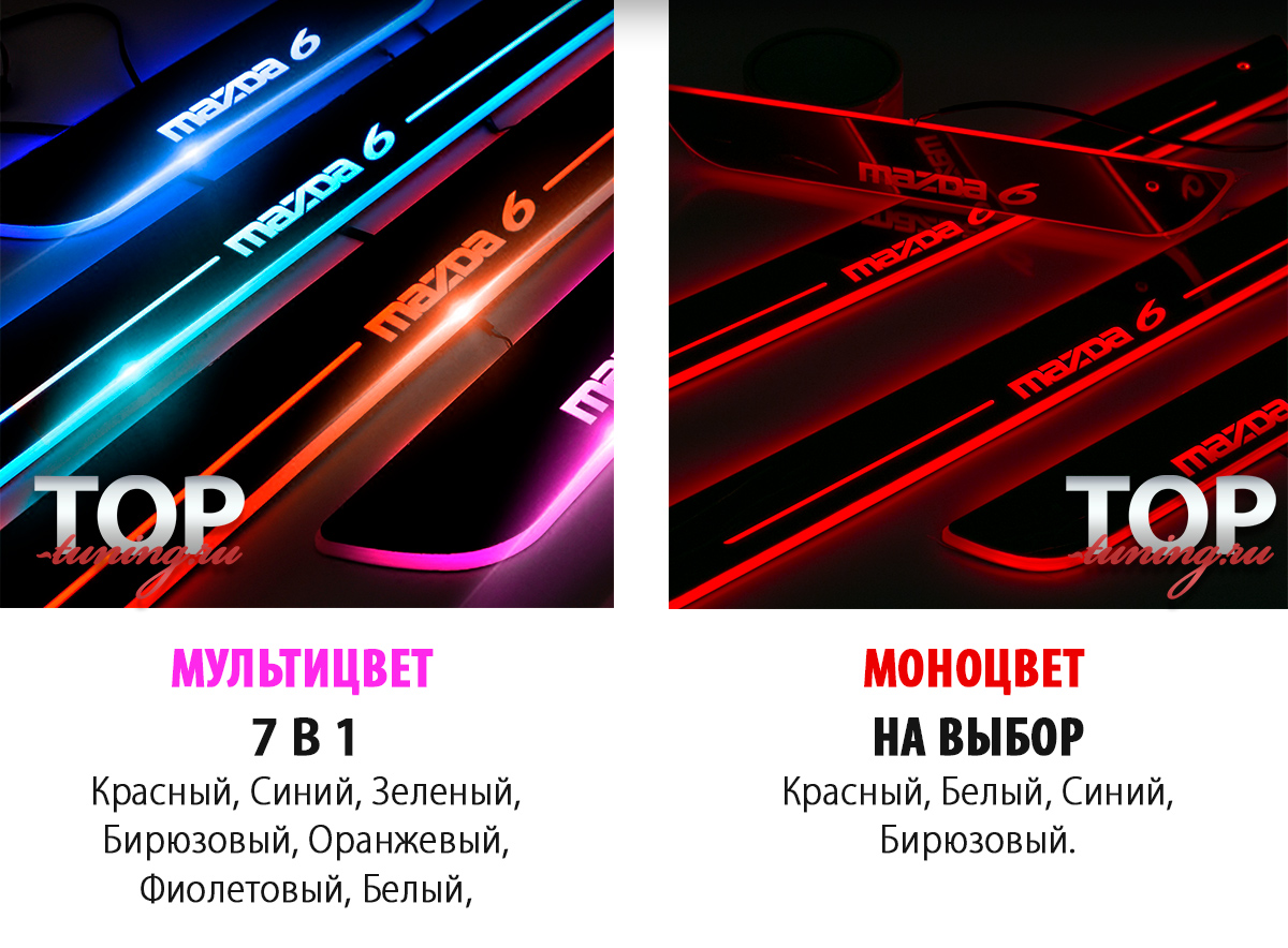 Защитные протекторы порогов в салоне. Комплект - 4 элемента + проводка. Сверхъяркие светодиоды, режимы плавного свечения, пульсации и бегущими огнями при открывании дверей. Логотип MAZDA 6 на слое зеркального пластика выгравирован при помощи высокоточного лазерного оборудования. Легкий монтаж и быстрое подключение. Рекомендуем установку в тех центре (г. Москва). Обратная поверхность накладок оснащена клеевым слоем (двусторонний скотч).