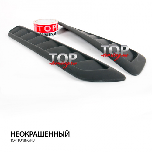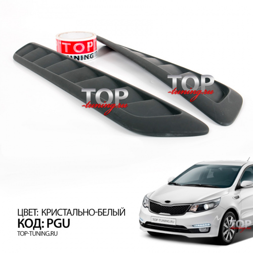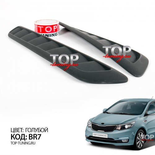 По умолчанию жабры не имеют продувных отверстий и выполняют декоративную функцию. Для установки на автомобиль, резать капот не нужно. Спортивные воздухозаборники выполнены с учетом геометрии капота Kia Rio 3 имеют винтовой наклон соответствующий изгибу штатного капота и плотно прилегают к оригинальной поверхности. Детали выполнены из АБС пластика, не окрашены. Устанавливаются без подгонки.