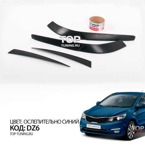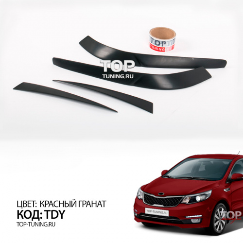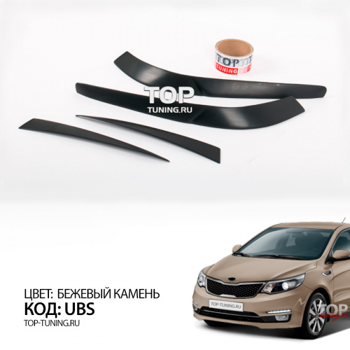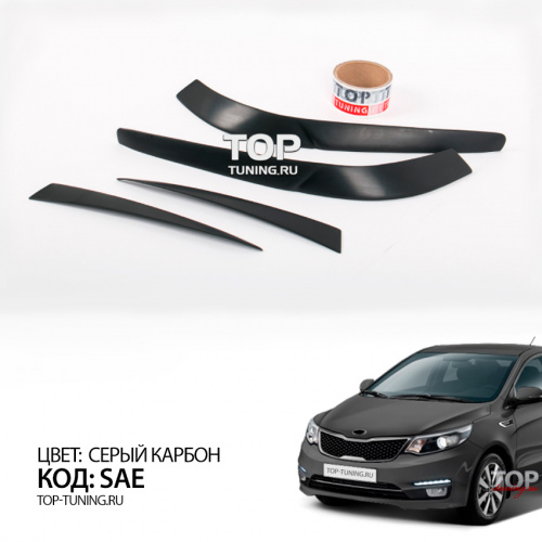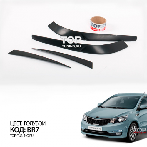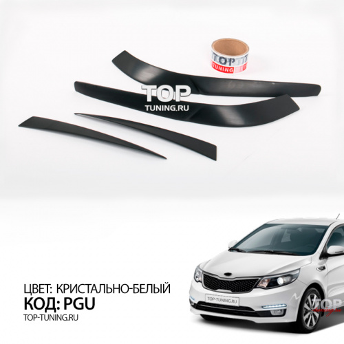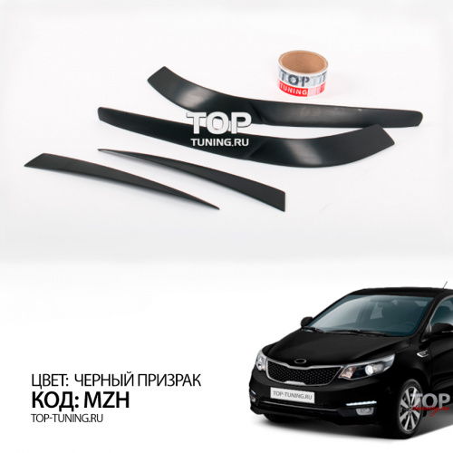 Набор состоит из четырех накладок. Материал - качественный АБС пластик. Простой монтаж, без подгонки, на двухсторонний 3М скотч с использованием специального праймера адгезии для улучшения сцепления деталей с кузовом автомобиля. Специальный кант для нанесения скотча и сохранения минимального зазора между оптикой и ресничками.