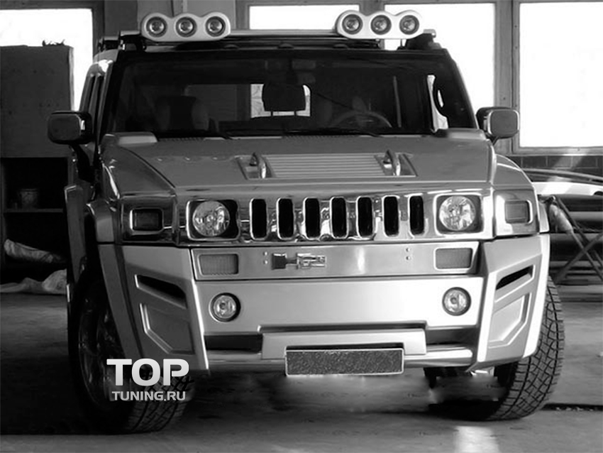 Передний бампер из обвеса Agressor для тюнинга передней части Hummer H2. Материал - композитный пластик. Бампер поставляется в неокрашенном виде. По краям бампера расположены технологические углубления для установки дополнительного комплекта противотуманных фар (не входят в комплект поставки). Потребуется профессиональная сборка и подгонка на автомобиле перед окрашиванием. Бампер может быть установлен только при наличии расширителей и порогов из обвеса Agressor.