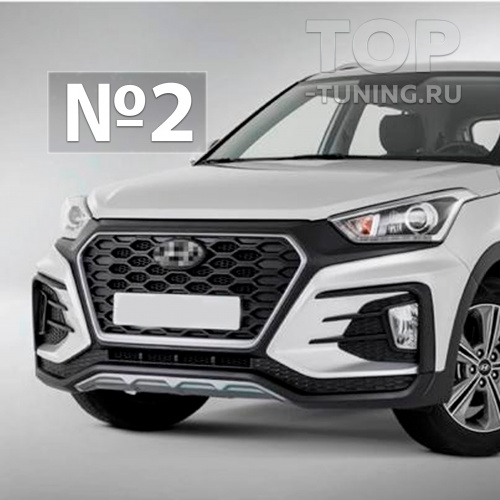 Тип №2 - бампер окрашивается в цвет по оригинальному коду краски Hyundai Creta на выбор. Решетка радиатора, центральная часть бампера вокруг решетки радиатора и декоративные вставки окрашиваются в черный, матовый цвет. Центральный диффузор и окантовка решетки радиатора окрашиваются в светло-серебристый глянцевый цвет.