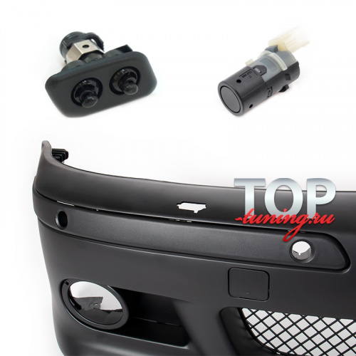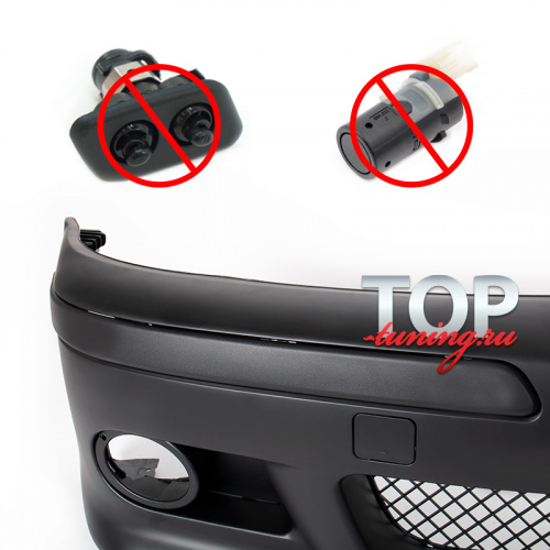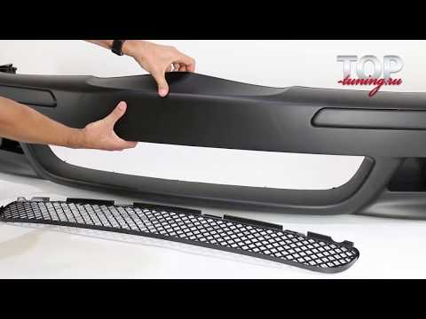 Бампер изготовлен из полиуретана. Гибкий пластик отлично держит форму и превосходно резонирует легкие удары или зацепы во время эксплуатации автомобиля. Бампер поставляется с заглушкой буксировочной петли, молдингами и декоративной сеткой. Противотуманные фонари устанавливаются от BMW E39 M5 (приобретаются отдельно). Установка в тех центре Топ Тюнинг по предварительной записи. Для правильной установки бампера рекомендуется дополнительно приобретать передние подкрылки от М5 версии.