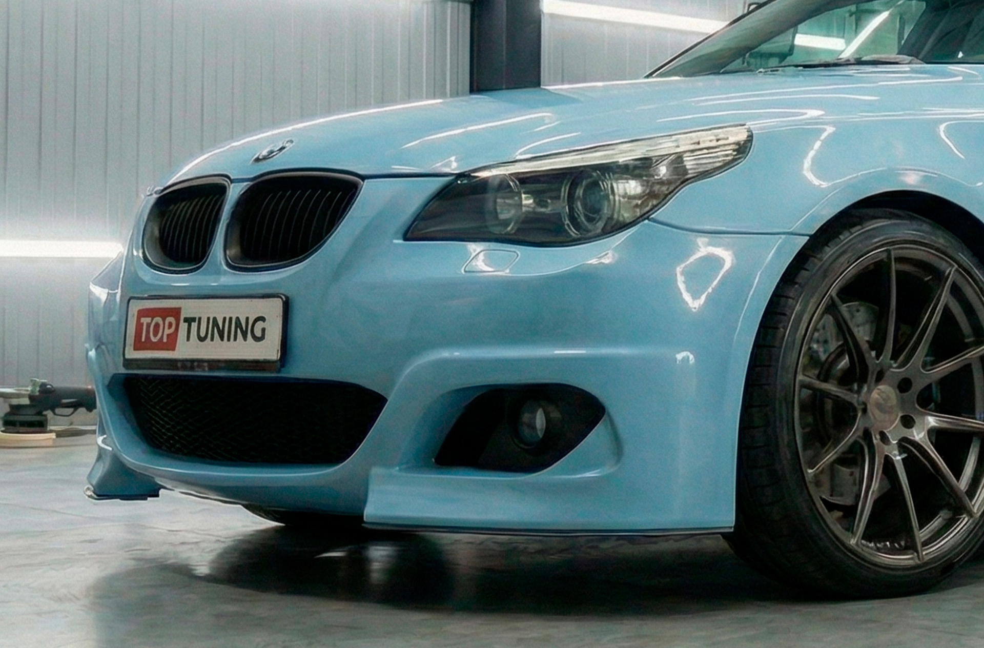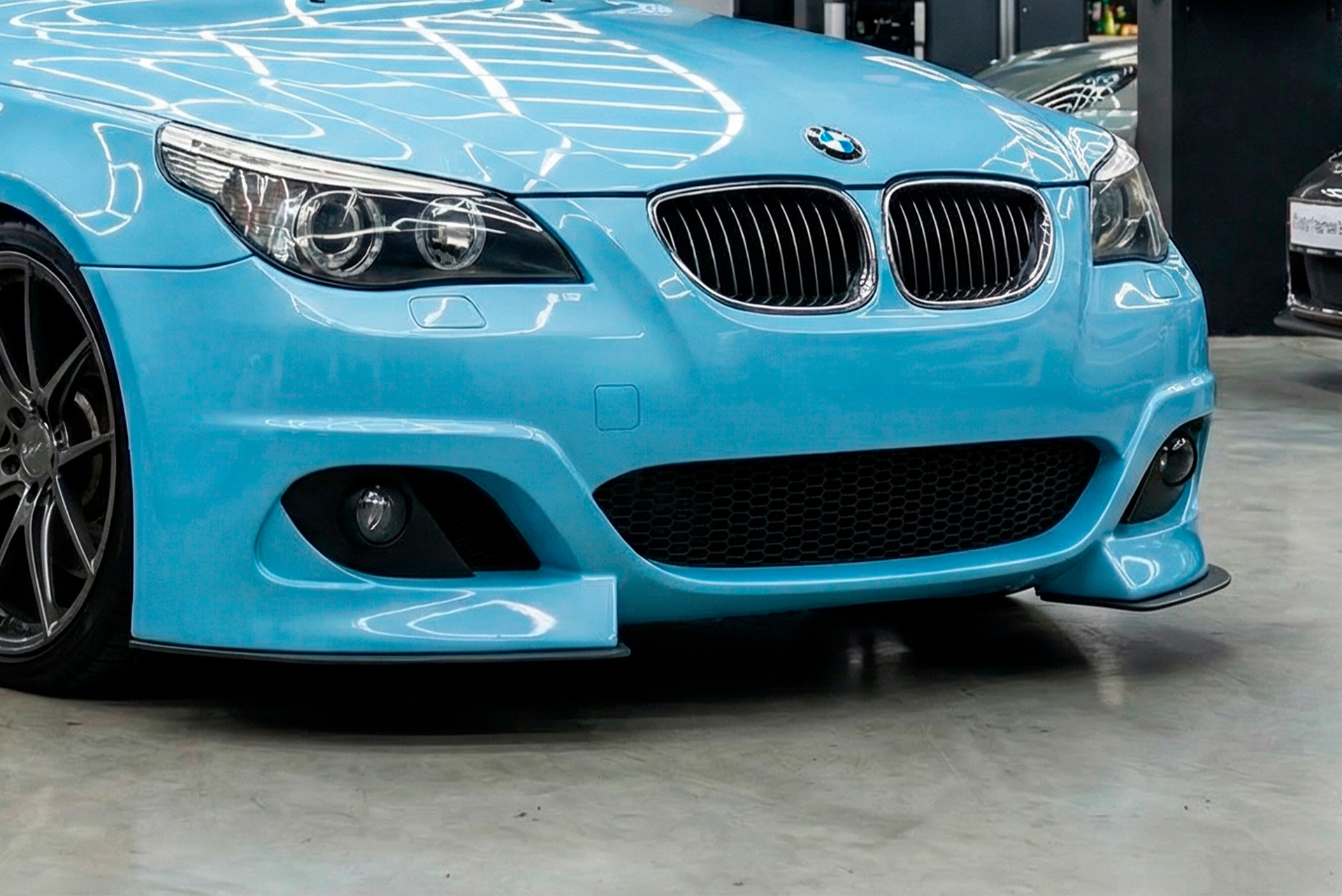 Дизайн бампера отличается выраженными, «суровыми» линиями скул и крупными, глубокими воздухозаборниками. Такая конструкция не только придает фронтальной части автомобиля мощный, спортивный вид, но и визуально делает его более широким и приземистым. Бампер выглядит цельно и гармонично, не нарушая общую стилистику кузова E60/E61, а лишь развивая ее в более радикальном ключе. Этот элемент обвеса выделит автомобиль из потока, оставаясь при этом образцом европейского тюнинга.