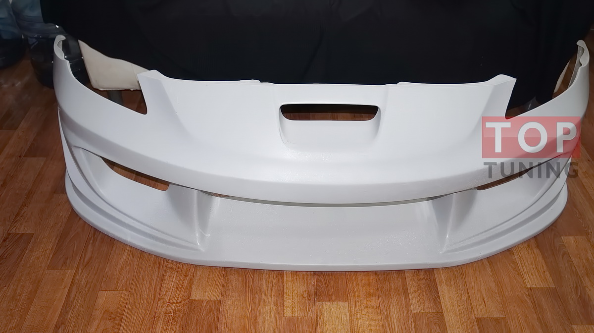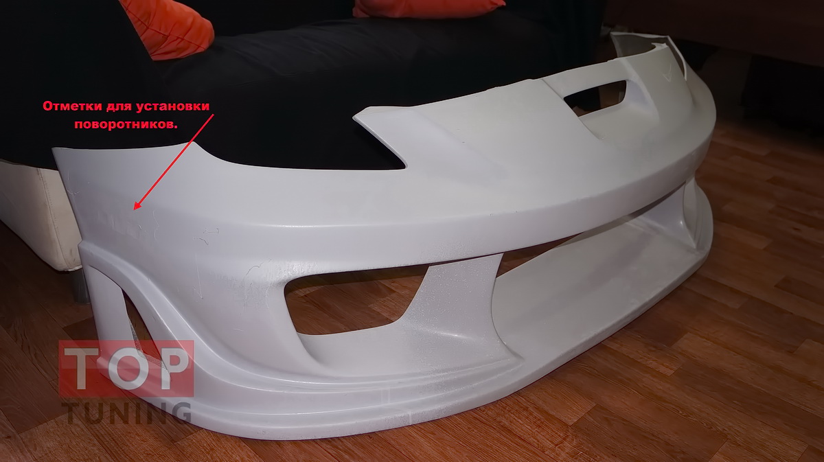 Деталь выполнена из качественного стеклопластика, не окрашена. При установке бампера потребуется немного подрезать нижний край усилителя бампера или уменьшить глубину воздухозаборников бампера. Деталь изначально не имеет выреза под габаритные огни (дополнительные повторители поворота). При необходимости данные отверстия вырезаются по контуру. Рекомендуем ознакомится с нашим каталогом декоративных сеток для бамперов.