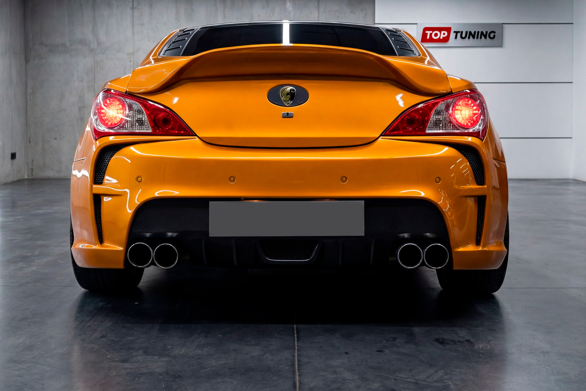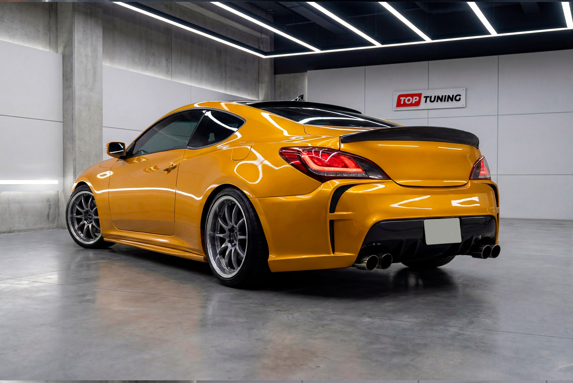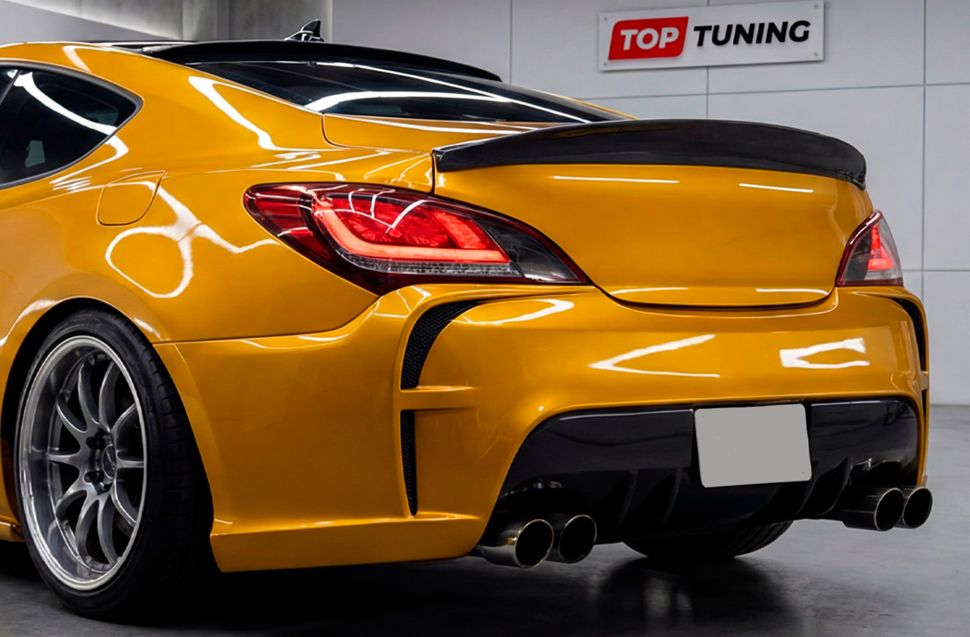 Центральным элементом композиции является ярко выраженный диффузор с выступающим центральным килем (сплиттером). Эта деталь не только добавляет агрессии, но и функционально структурирует пространство под задней частью автомобиля. В центральную секцию диффузора можно интегрировать дополнительный диодный стоп-сигнал, аналогичный тем, что используются на гоночных болидах, что повысит безопасность и уникальность вашего Genesis Coupe. Альтернативный вариант — установка декоративной алюминиевой или пластиковой сетки для защиты внутренних элементов и придания завершенного вида.