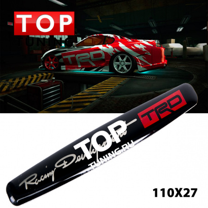 Наклейка шильдик TRD (Toyota Racing Development) Черная, на алюминиевой подложке с двусторонним скотчем. Размер 110 * 27 мм.