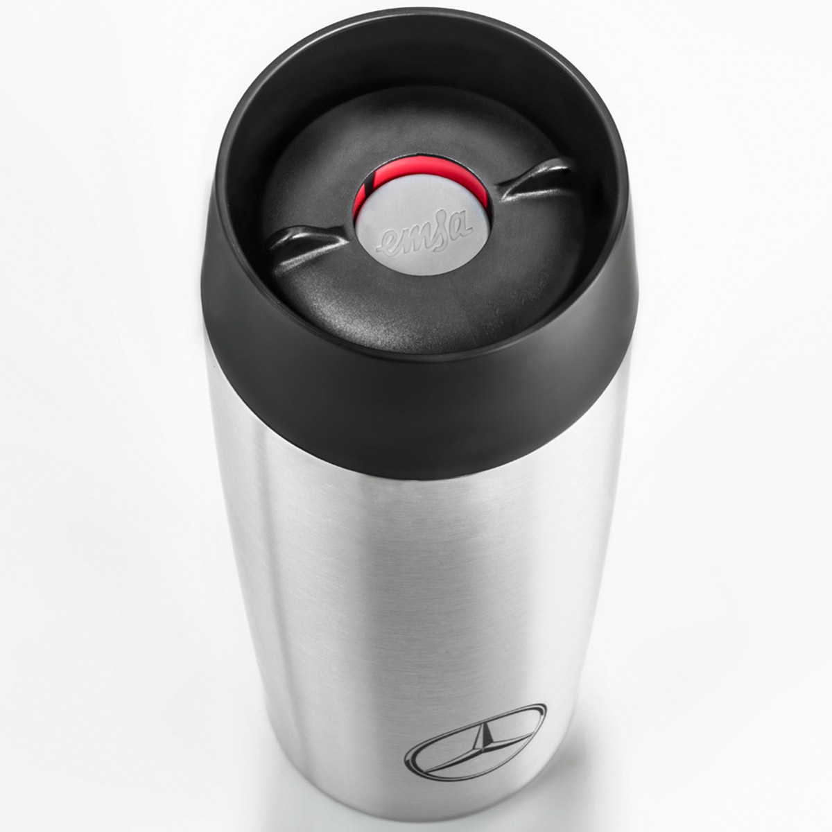 Оригинальная термокружка из нержавеющей стали (Thermo Mug) с двойными стенками от компании Mercedes-Benz поможет сохранить тепло Вашего напитка до 6 часов, а холодные напитки до 12 часов. Чашка термос выполнена в серебристом матовом цвете с лазерной гравировкой звезды Мерседес. На крышке расположена кнопка-клапан, благодаря этому пить напитки намного удобнее (чем со сдвижной шторкой). А благодаря своей форме и отсутствию выступающих деталей (в виде ручек), кружку легко можно положить в сумку или рюкзак. Чашку можно мыть в посудомоечной машине.