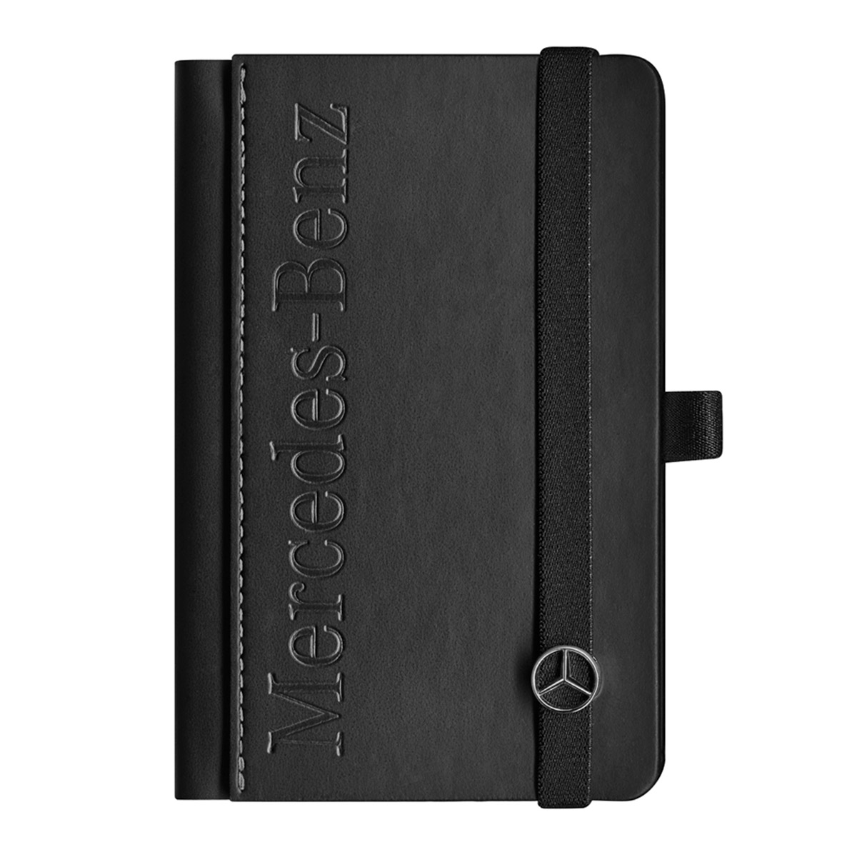 С небольшой записной книжкой от компании Mercedes Вы не забудете все Ваши спонтанные идеи или важные заметки. Маленький блокнот в черном дизайне и рельефной надписью Mercedes-Benz имеет 192 листа, по стандарту FSC, что является показателем того, что Мерседес-Бенц заботится о своей репутации как о социально и экологически ответственной компании. Последние 32 страницы оснащены перфорацией, для того, что бы их можно было легко вырвать. Серая закладка, эластичная петля для ручки, тканевый ремешок шириной около 1,4 см. а также внутренний карман с клапаном на спинке, делают записную книжку более привлекательной и удобной в использовании.