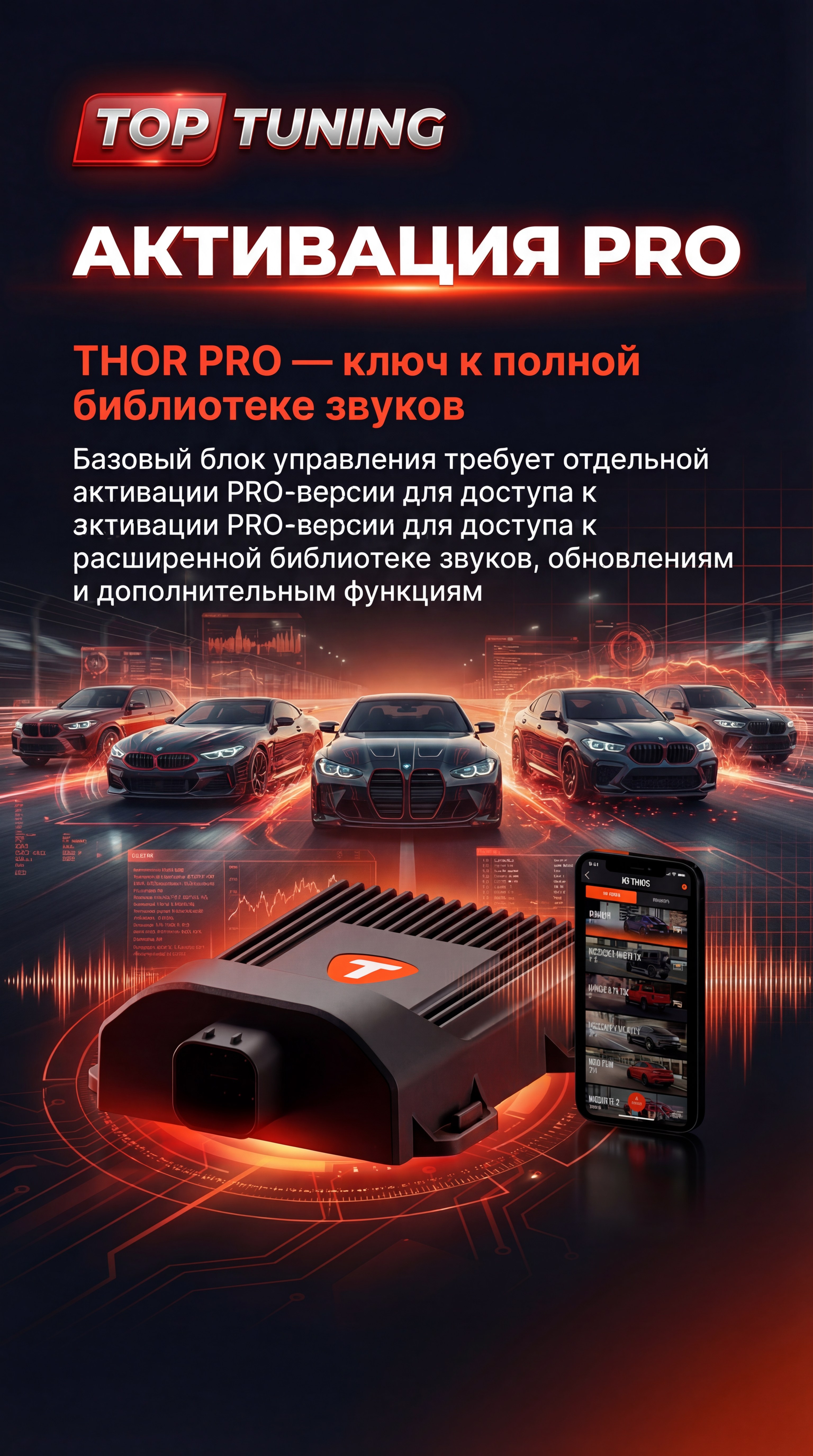- THOR PRO: Ваша система «эволюционирует». Вы получаете регулярное пополнение библиотеки звуков. Как только инженеры записывают новый звук (например, нового Mercedes-AMG или Porsche), он становится доступен вам бесплатно.