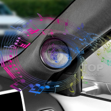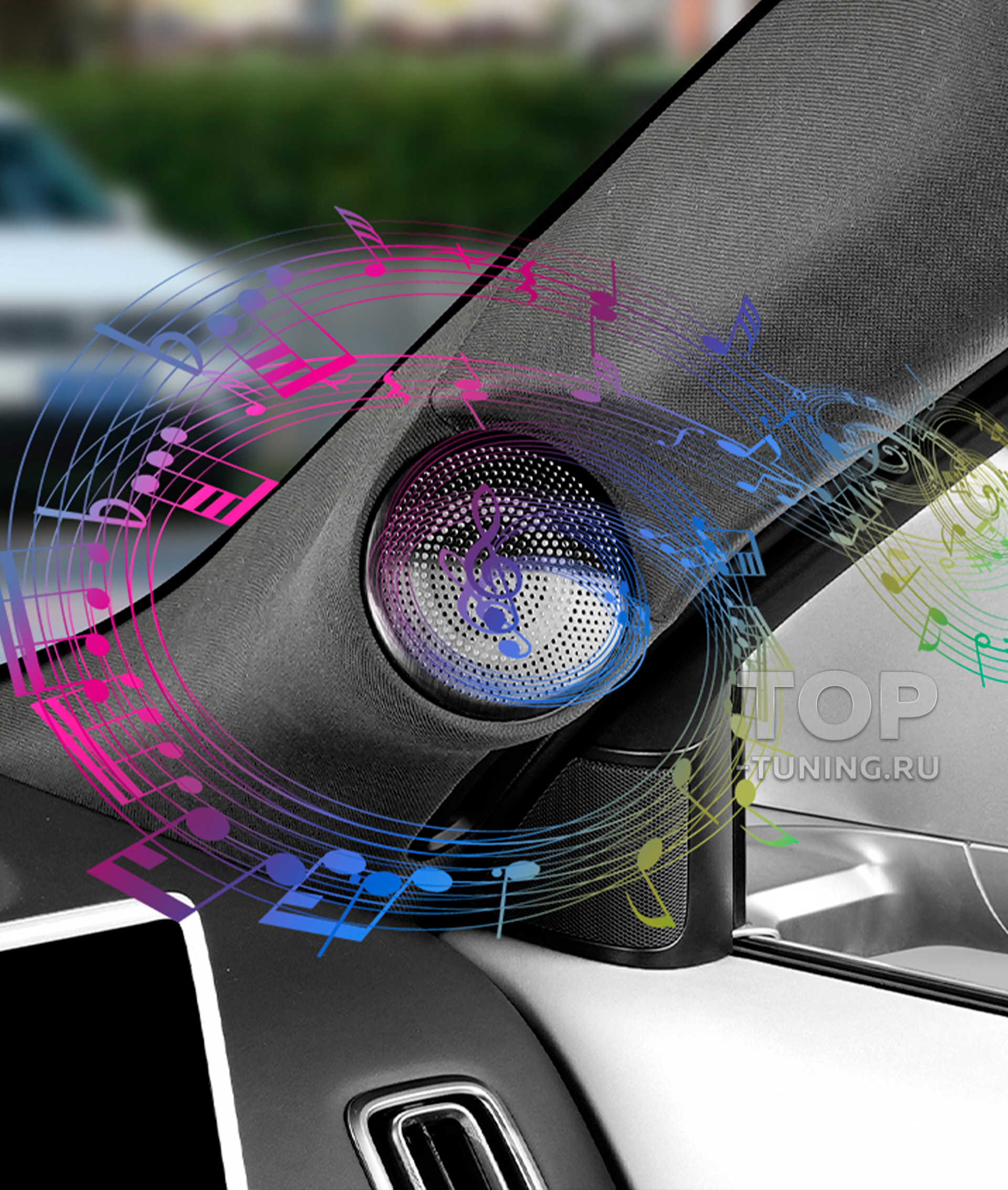 Подключение осуществляется в штатное место без доработок, а встроенная подсветка динамиков синхронизируется с заводской атмосферной иллюминацией салона, формируя единое визуальное и акустическое пространство.