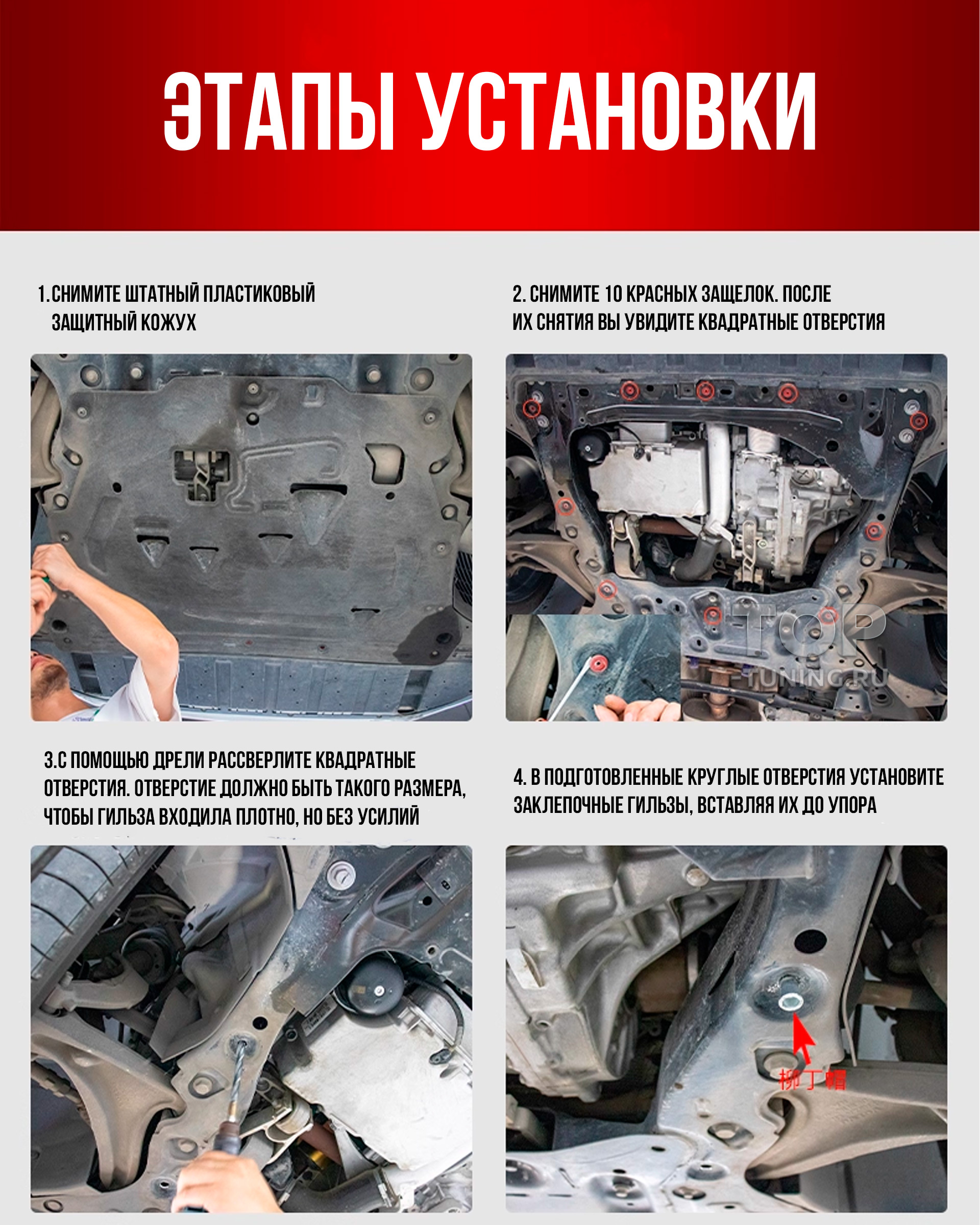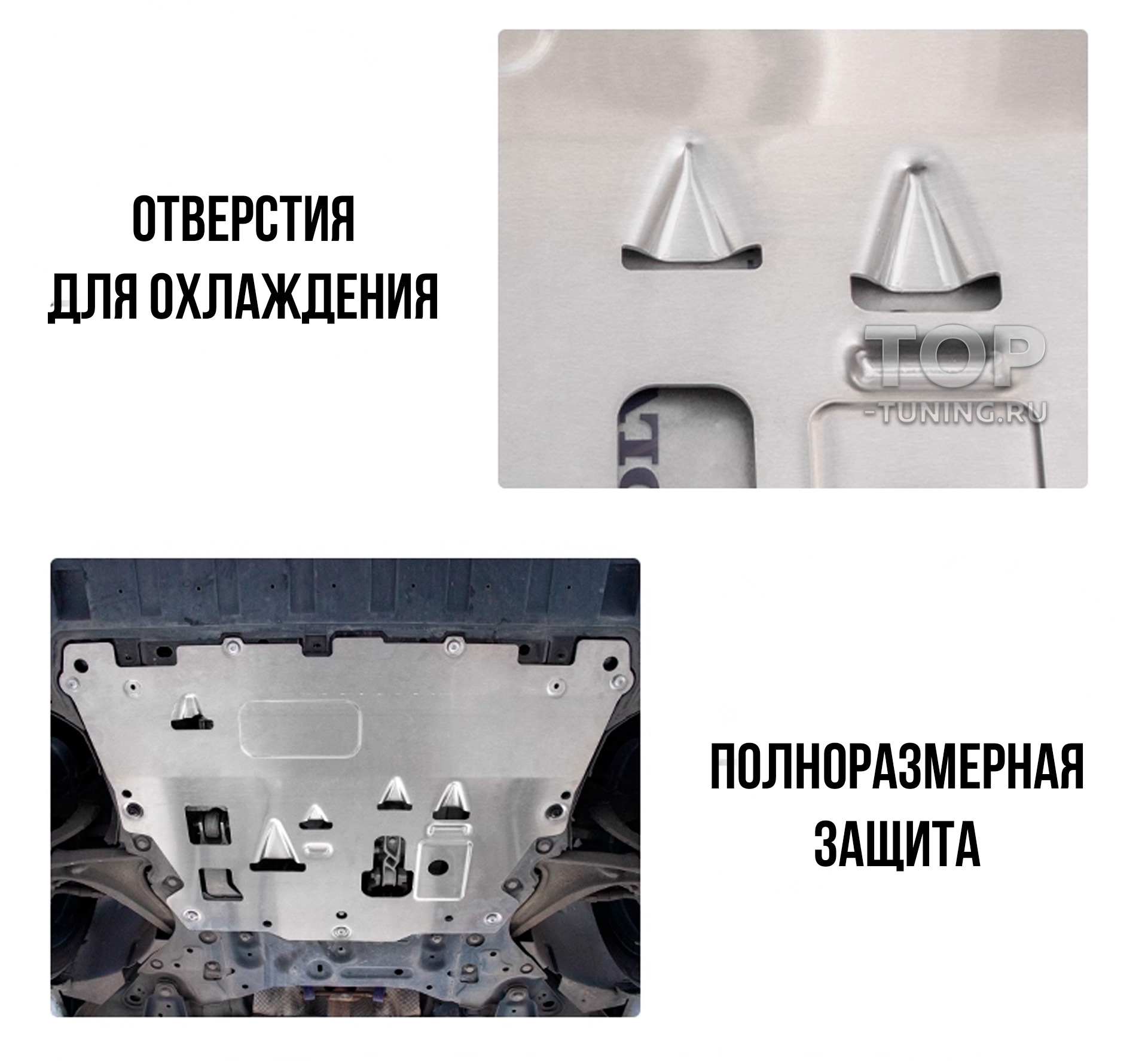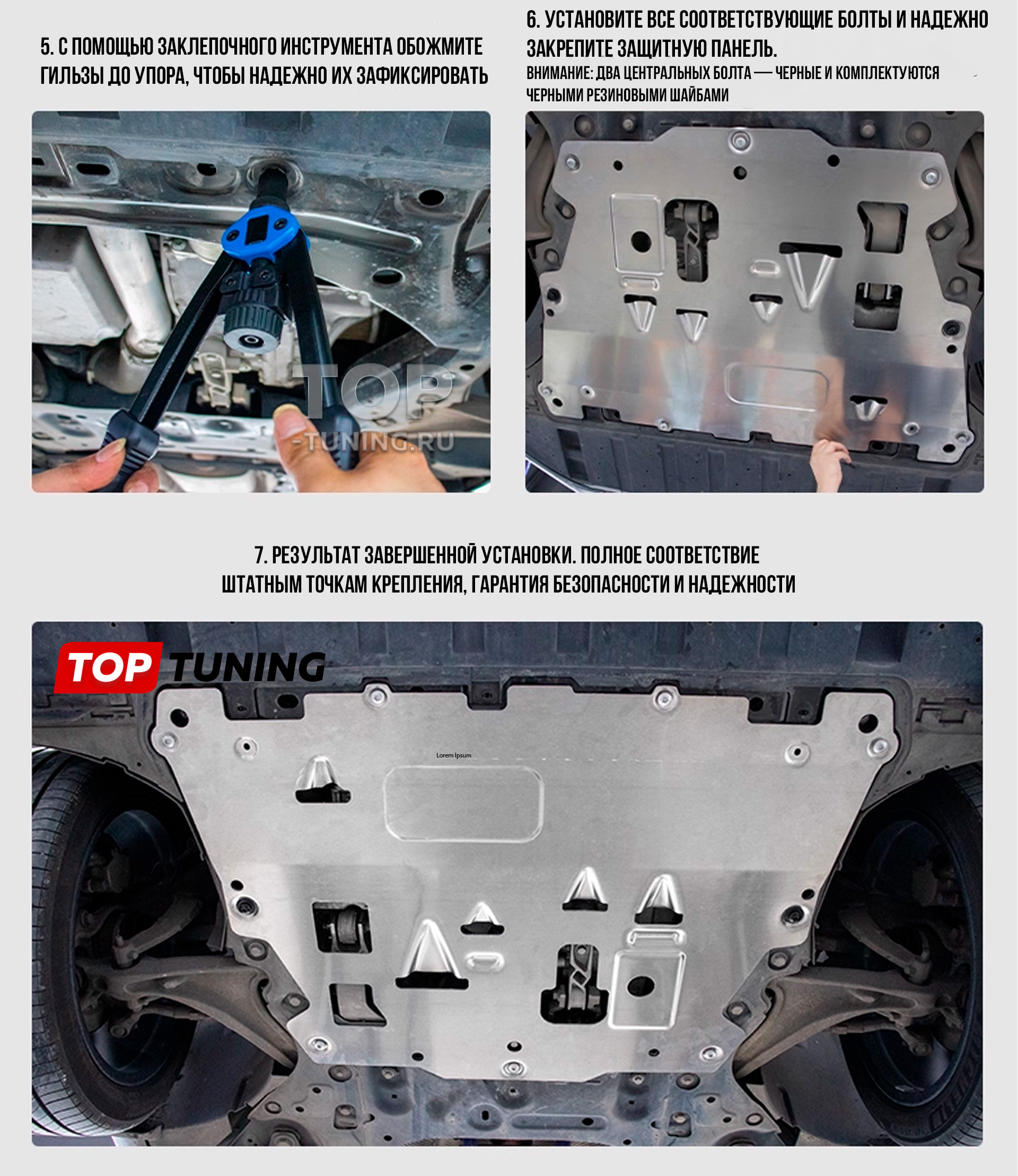Форма защиты повторяет линии штатного поддона, сохраняя аэродинамику автомобиля и дополнительно снижая уровень шума от дороги.