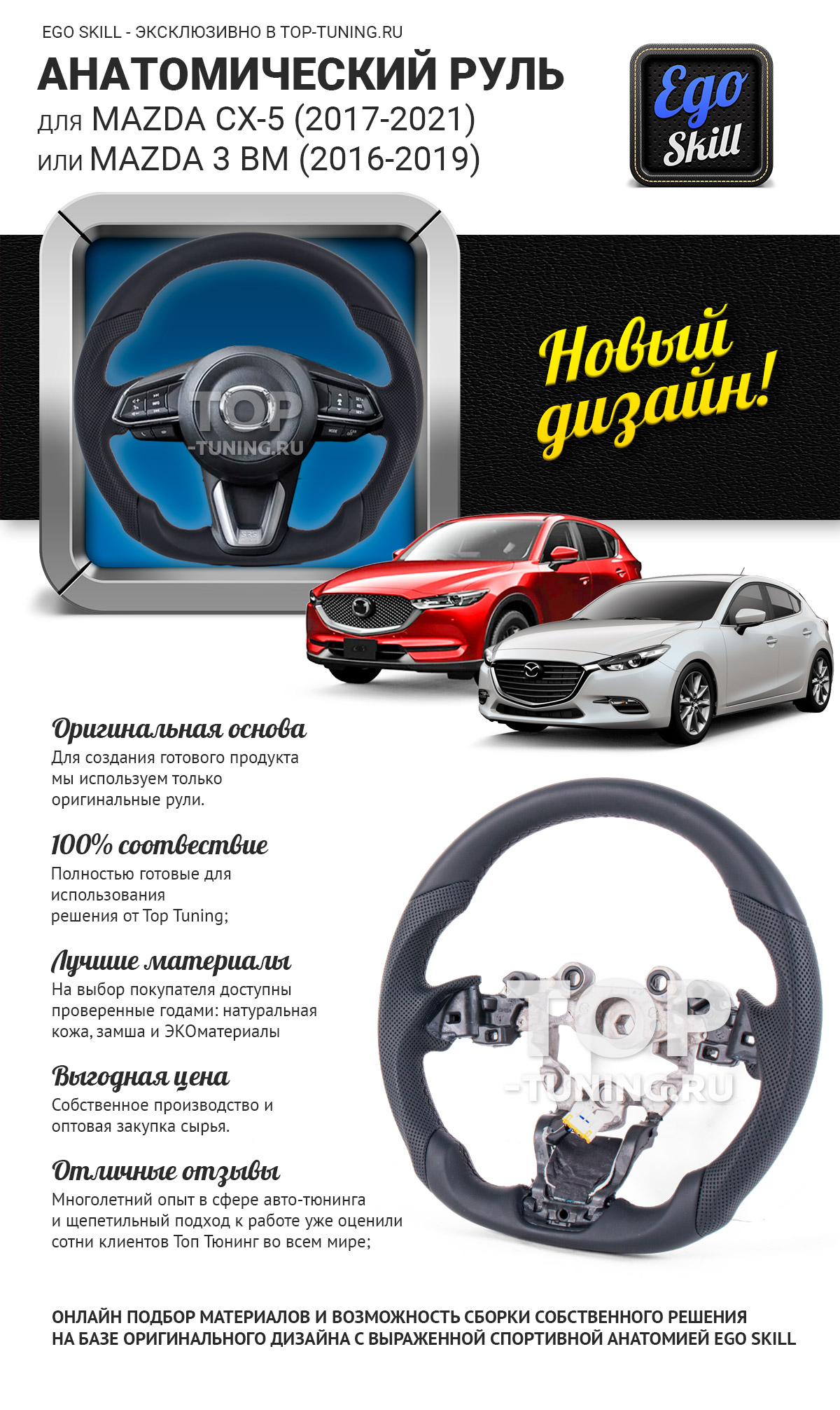 Многолетний опты в работе с автомобильными салонами и собственные разработки с использованием успешных решений от лучших мировых тюнинг ателье и производителей спортивных суперкаров, позволили нам создать новейший и не имеющий аналогов дизайн руля, созданный специально для Mazda CX-5 (2017-2021).