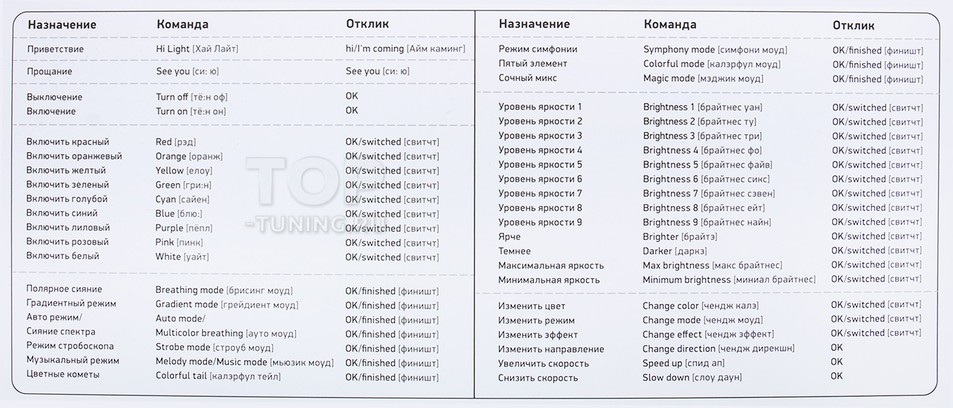 Так же управлять режимами можно через встроенного голосового помощника "Hi Light!". Список команд для управления системой Ambient Light в комплектации. Все выбранные настройки сохраняются и автоматически и активируются при включении зажигания или при запуске двигателя, в зависимости от выбранного типа подключения системы к автомобилю.