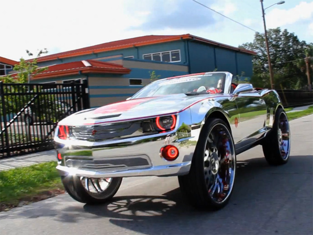 Chevrolet Camaro с 32-дюймовыми дисками "Forgiato" в хромированном кузове на подвеске для "Big Fut".