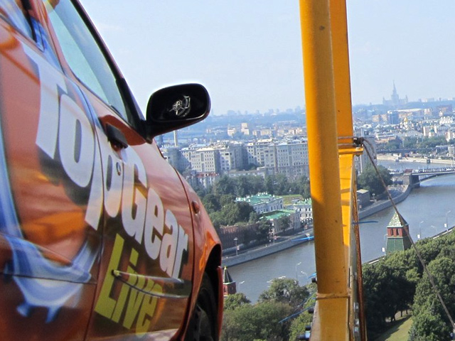 Top Gear Live показал правильный бендж-джампинг во время шоу в Москве. В этом хэтчбеке на всем протяжении трюка сидел живой водитель!