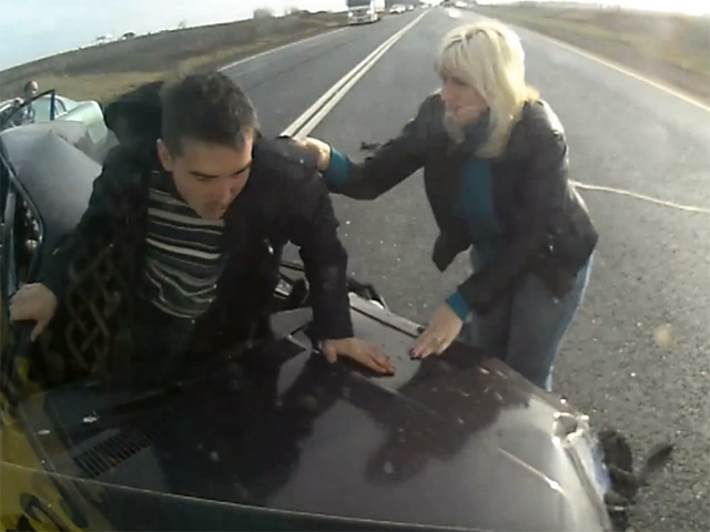 Не ясно пока, что случилось с водителем грузовика, выехавшего на встречную полосу, но удар оказался очень сильным. Но самое удивительно, что водитель синего грузовика после аварии стоял на ногах и не получил серьезных увечий.