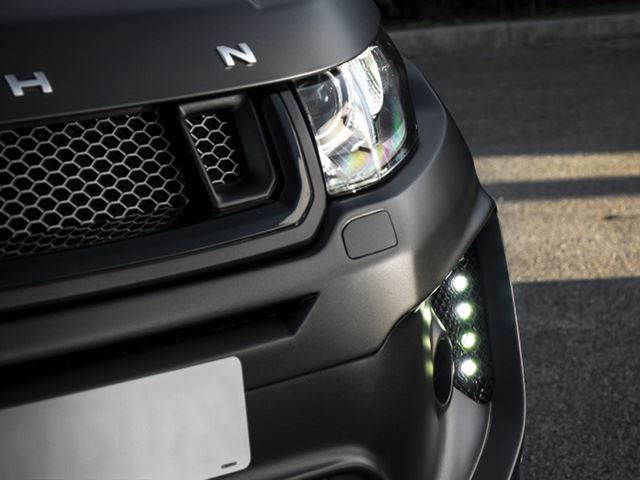 Внешний облик дополнен спойлером на крыше и крышке багажника, а 22-дюймовые диски делают вид автомобиля неотразимым. За счет новых пружин Evoque стал ниже на 20 мм. Перфорированные черный кожа наппа украшает сиденья и центральный тоннель, на заказ можно добавить контрастную строчку, красные датчики, селектор передач с инкрустацией алмазами, алюминиевые педали и фирменный бредингом тюнинг-ателье.