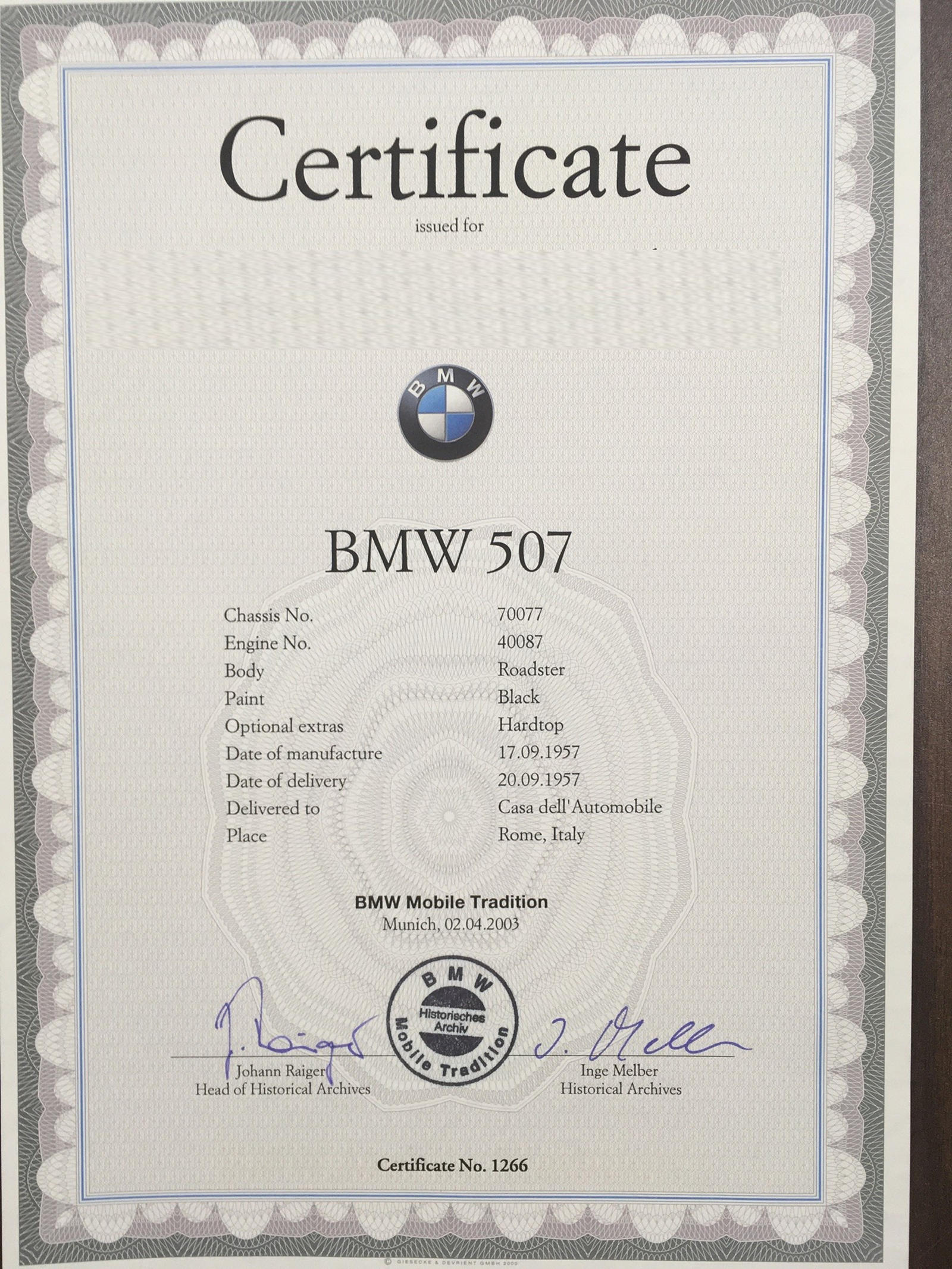 Это один из примерно 250 экземпляров, когда-либо изготовленных и сошедших с конвейера 17 сентября 1957 года. Первоначально он был продан новым в Риме с номером шасси 70077, что делает его моделью Series II. Series II идентична Series I, за исключением меньшего 65-литрового бензобака в багажнике, поскольку гигантский 110-литровый бак моделей серии I был установлен за сиденьями и вызывал жалобы от владельцев, которые могли чувствовать запах бензина, когда жесткая крыша (которая идет с этим автомобилем) была на машине.