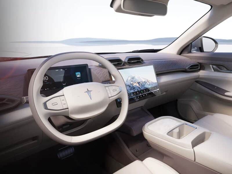 Интерьер автомобиля отличается минималистичным дизайном и двумя экранами с широкими рамками. Приборная панель водителя с диагональю 10,2 дюйма — это меньший экран, а центральный экран управления имеет размер 14,6 дюйма. Рулевое колесо оснащено плоским дном, а в центральном туннеле расположены два подстаканника и беспроводная зарядная панель.
