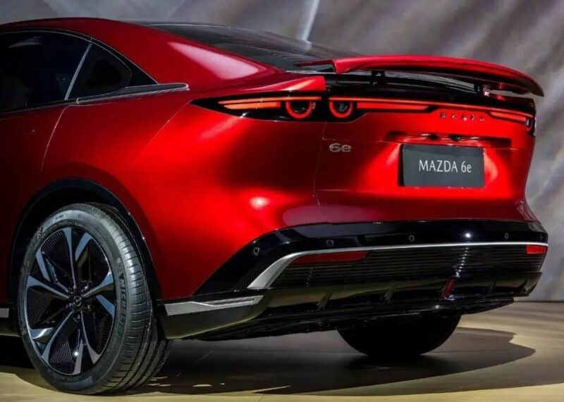 Mazda 6e создана на основе концепции дизайна Mazda Kodo Soul of Motion. Её отличительные черты — бескаркасные двери, решётка радиатора с подсветкой, скрытые дверные ручки и заднее антикрыло.