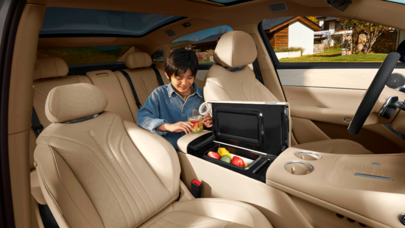 Под центральной консолью встроен холодильник объёмом 6,6 л с температурным диапазоном от -6 до 50 гр.