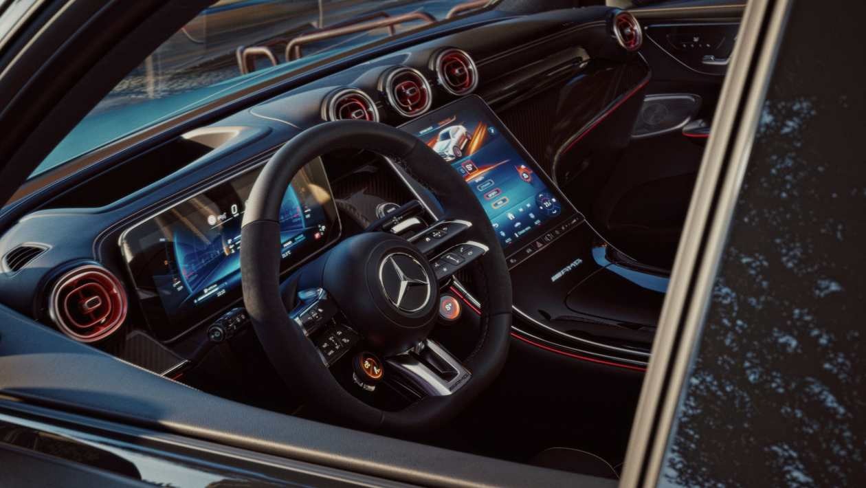 Интерьер сохранил прежний облик и оснащён пользовательским интерфейсом AMG с центральным сенсорным экраном и информационным дисплеем для водителя.