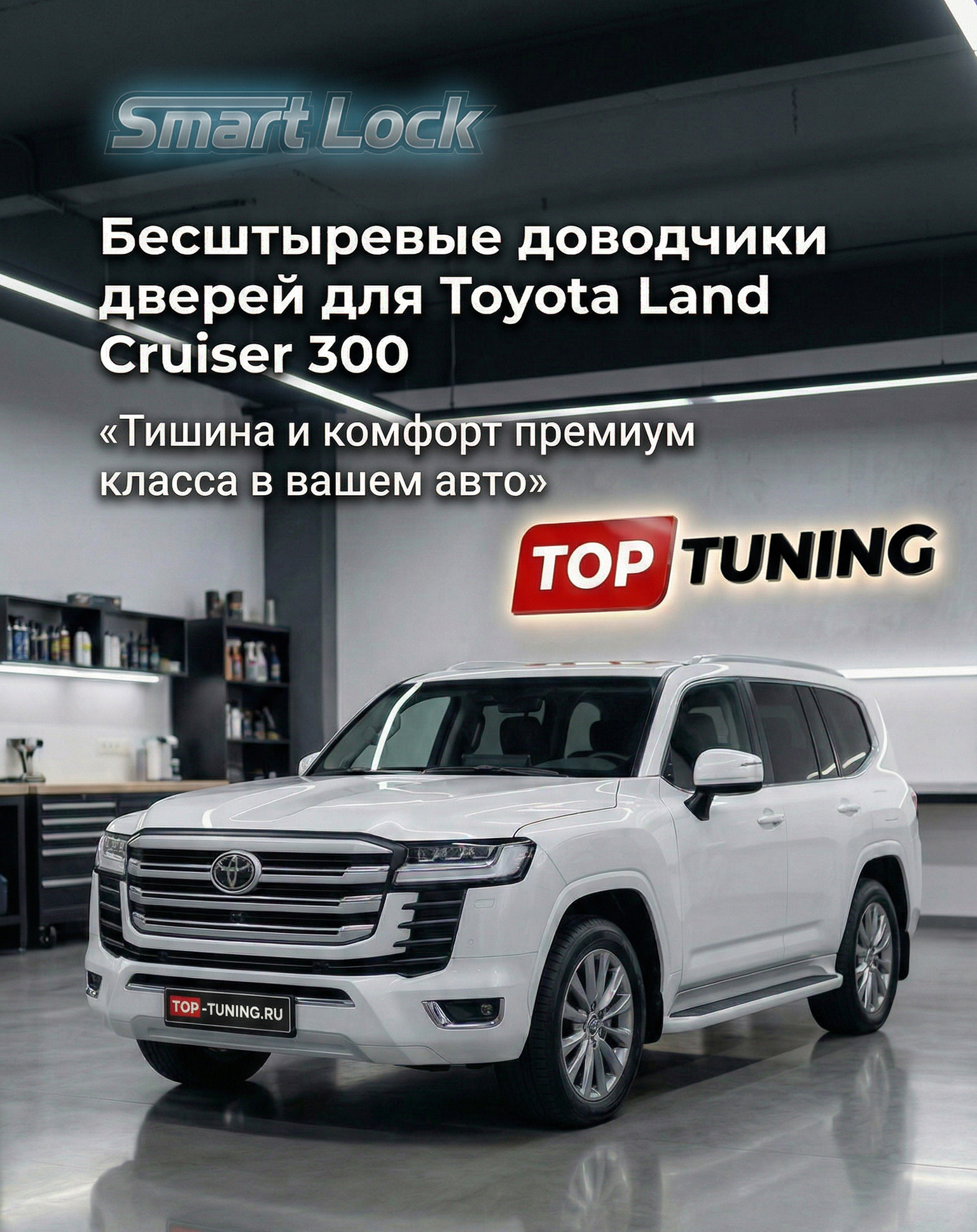 Smart Lock Premium для Toyota Land Cruiser 300 (2021+) — это электронная система автоматических доводчиков дверей, разработанная с учётом конструкции штатных замков флагманского внедорожника Toyota.