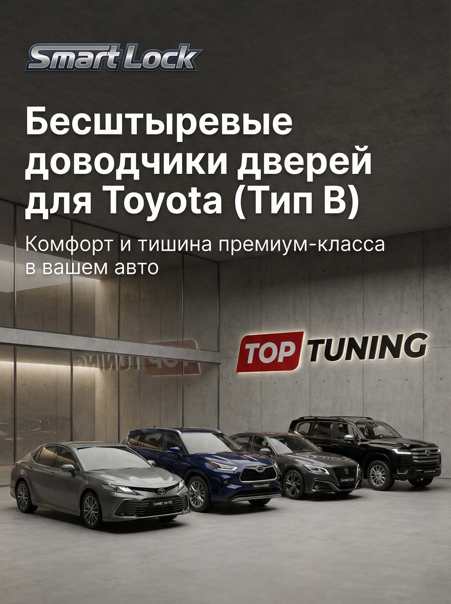 Установка бесштыревых доводчиков дверей Smart Lock Premium для Toyota (Тип B) выполняется в установочном центре TOP-TUNING.