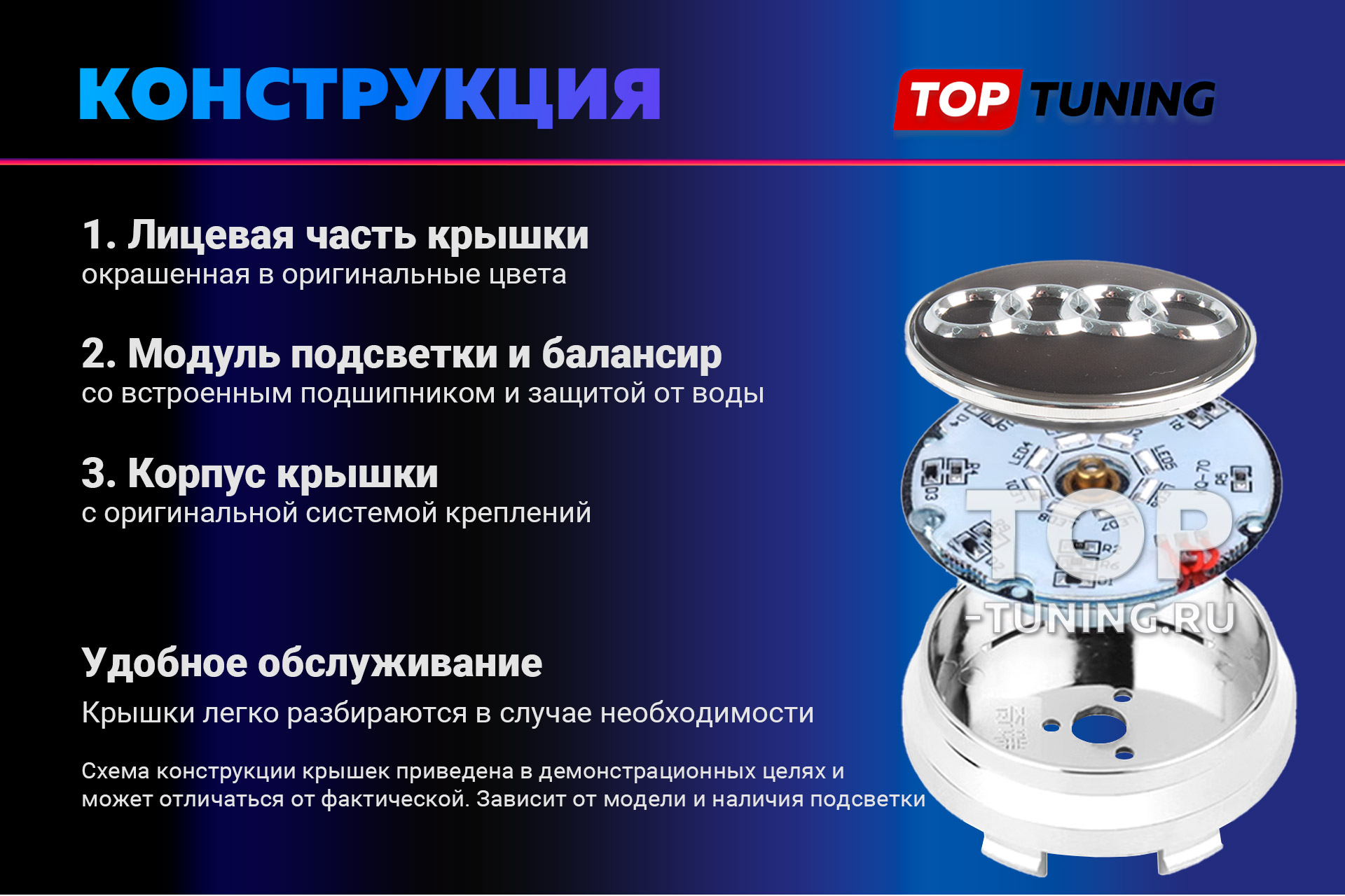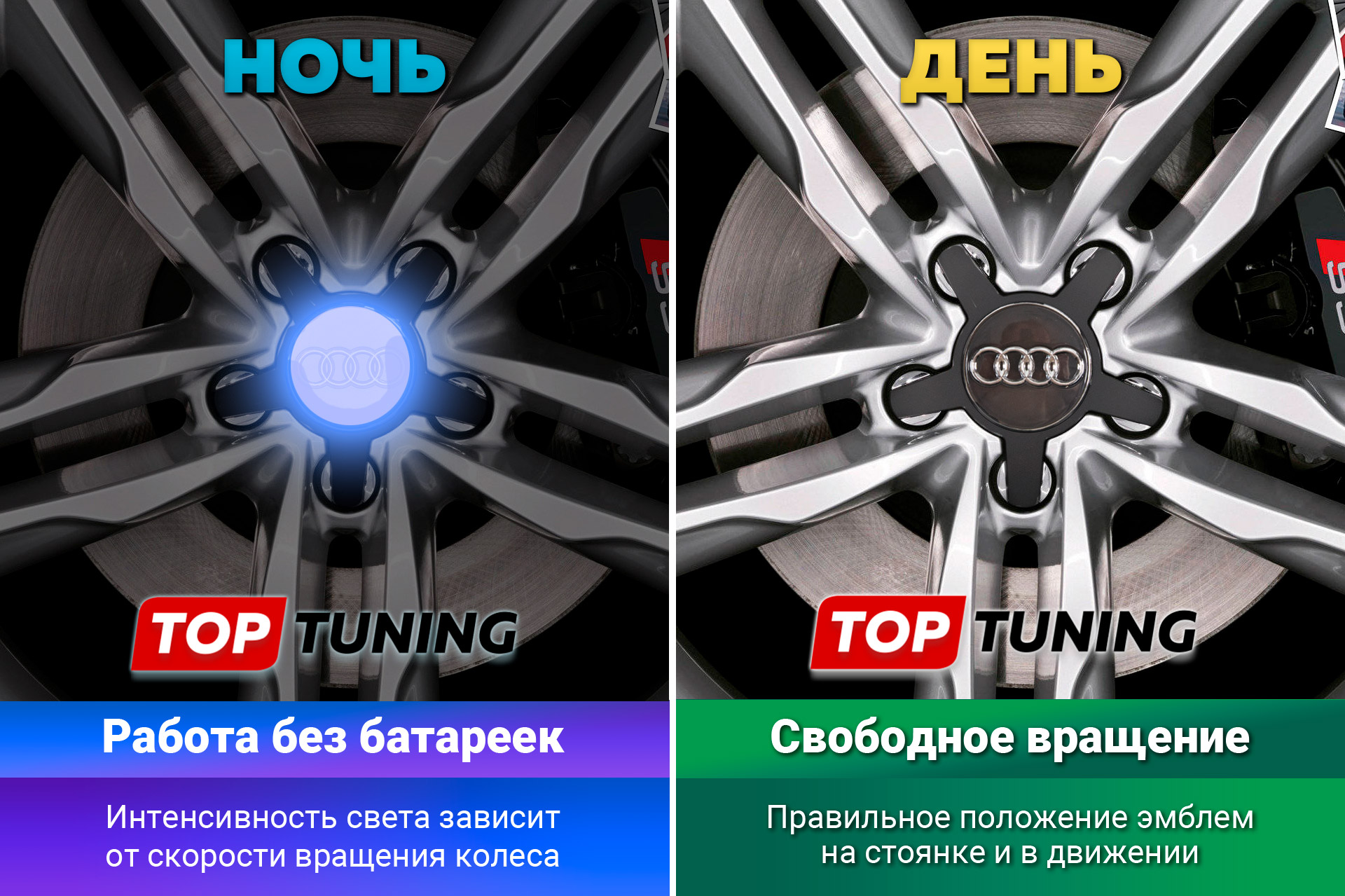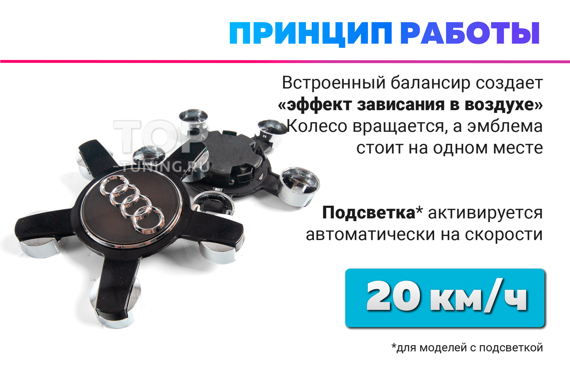 Чем выше скорость, тем ярче свечение эмблемы. Подсветка создает фоновое освещение центральной части колесного диска, что выглядит особенно привлекательно на отражающих поверхностях. Как только автомобиль остановился или скорость снизилась, подсветка выключится сама.
