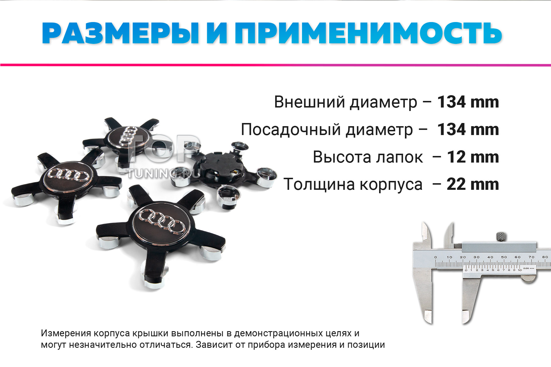 Набор подходит к оригинальным колесам дискам автомобилей Аudi TT, A4, A5, A6, A7, A8, R8, S6, S7, S8. Перед покупкой потребуется замерить внешний диаметр штатной эмблемы, он должен быть равным 134 мм, внутренний диаметр должен быть 134 мм.