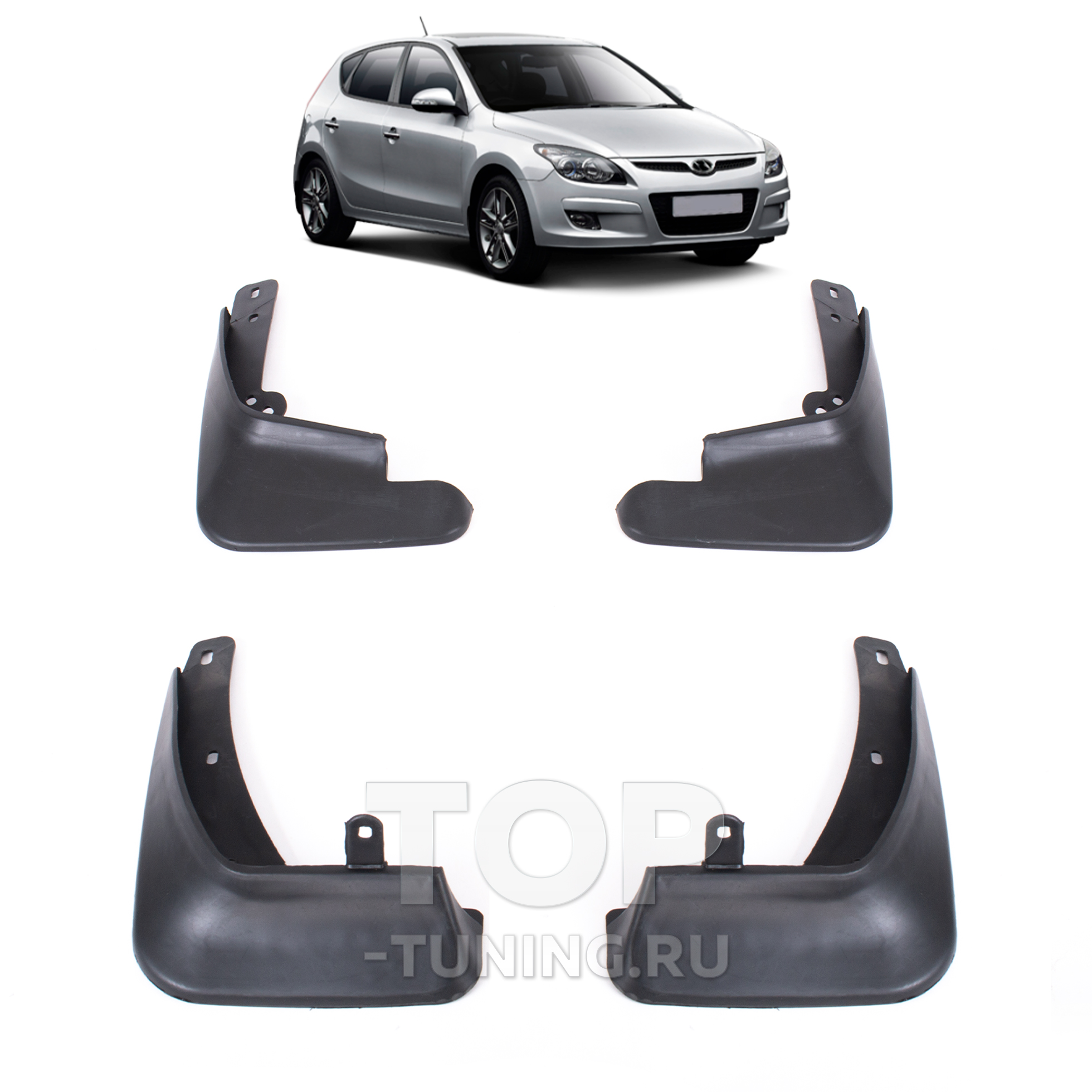 Фирменные брызговики CS Original для Hyundai i30 в кузове FD с 2007 по 2011 год выпуска. Изготовлены из эластичного полиуретана. Цвет пластика - черный. Лицевая поверхность брызговиков - структурная (шагрень).