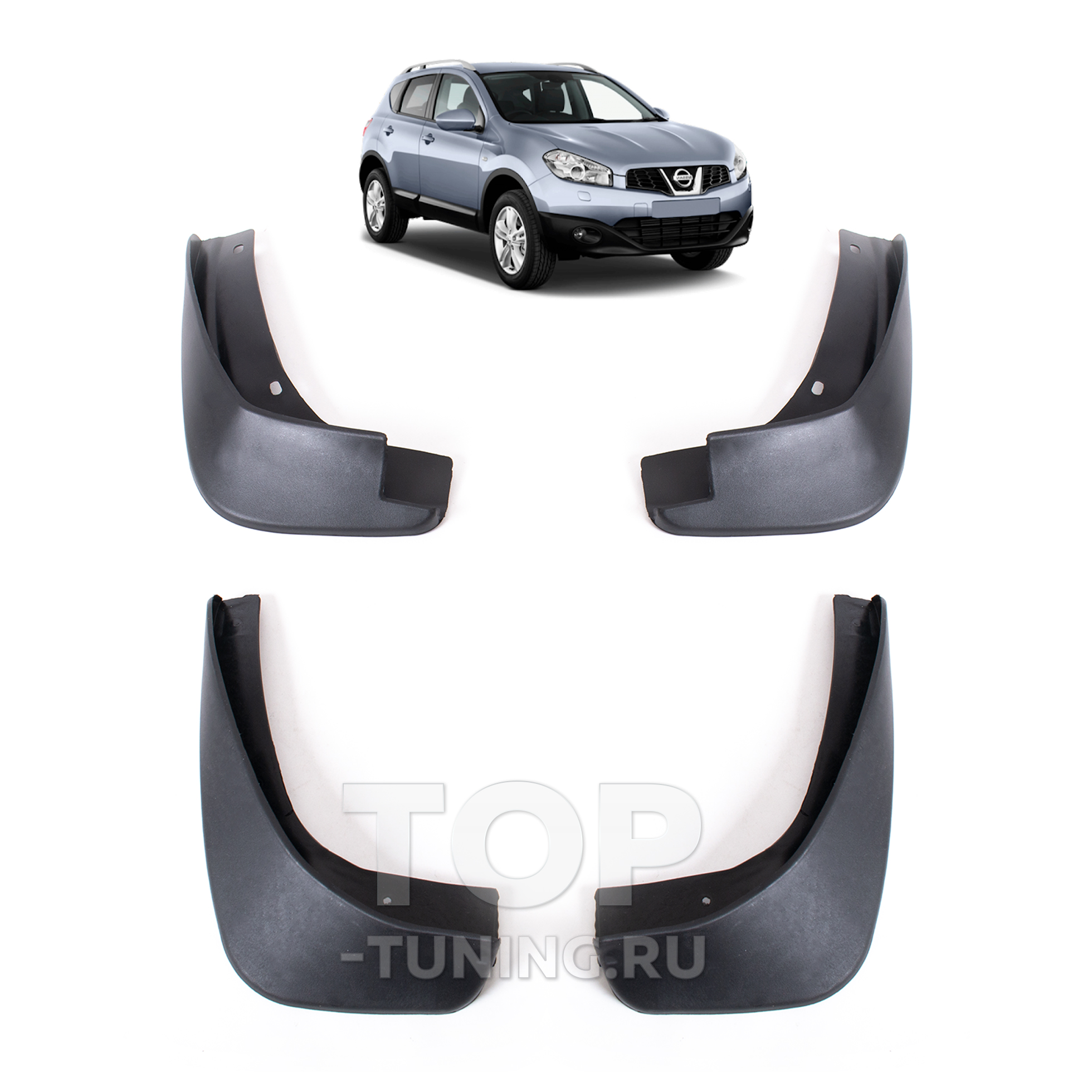 Фирменные брызговики CS Original для Nissan Qashqai 1-го поколения c 2007 по 2014 год выпуска. Изготовлены из эластичного полиуретана. Цвет пластика - черный. Лицевая поверхность брызговиков матовая.