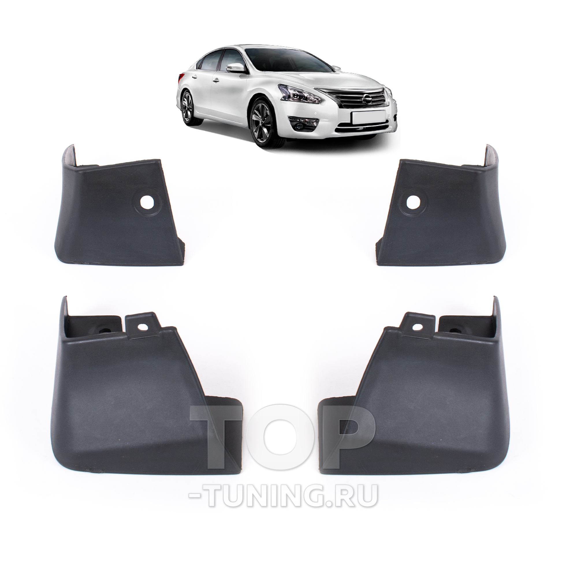 Фирменные брызговики CS Original для Nissan Teana 3-го поколения с 2013+ года выпуска. Изготовлены из эластичного полиуретана. Цвет пластика - черный. Установка на болтовые соединения или саморезы.