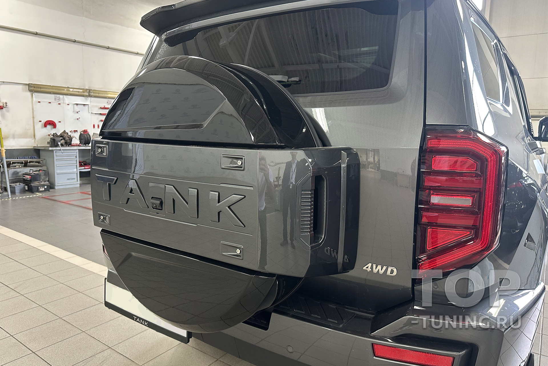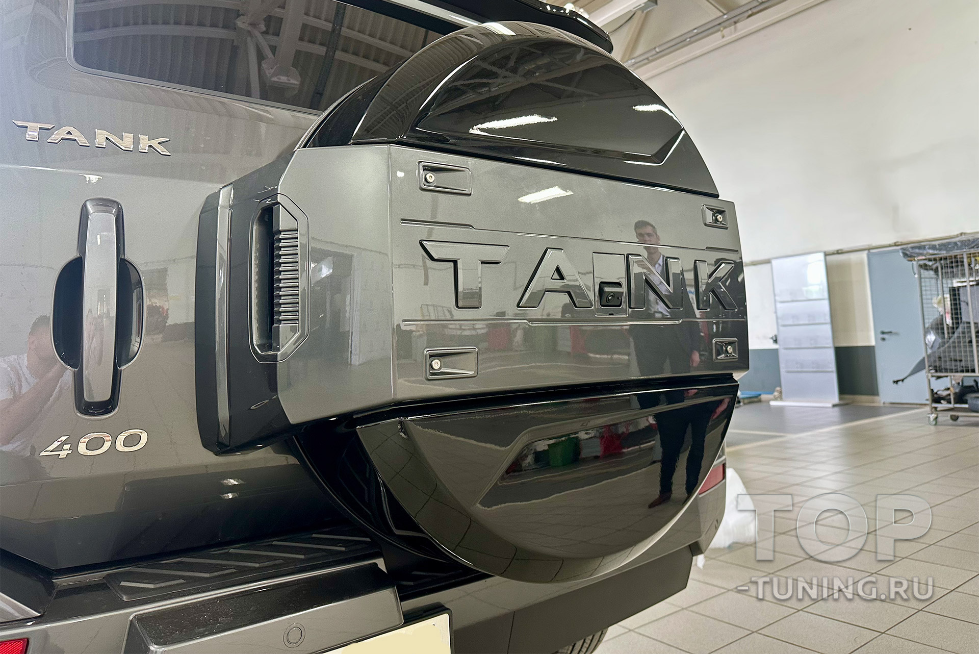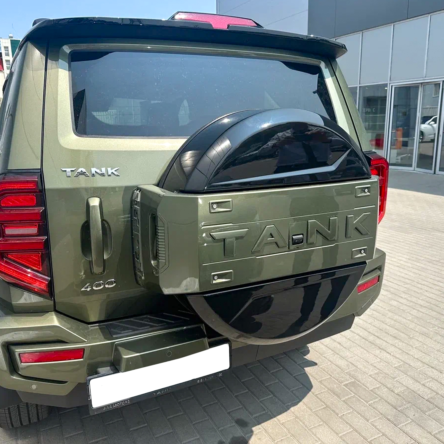 Чехол на запасное колесо для TANK 400, окрашенный в глубокий черный глянец, — это стильный и практичный аксессуар, созданный специально для защиты и украшения внедорожника. Он подчеркивает брутальный облик TANK 400 и придает задней части автомобиля завершенность и премиальный вид.