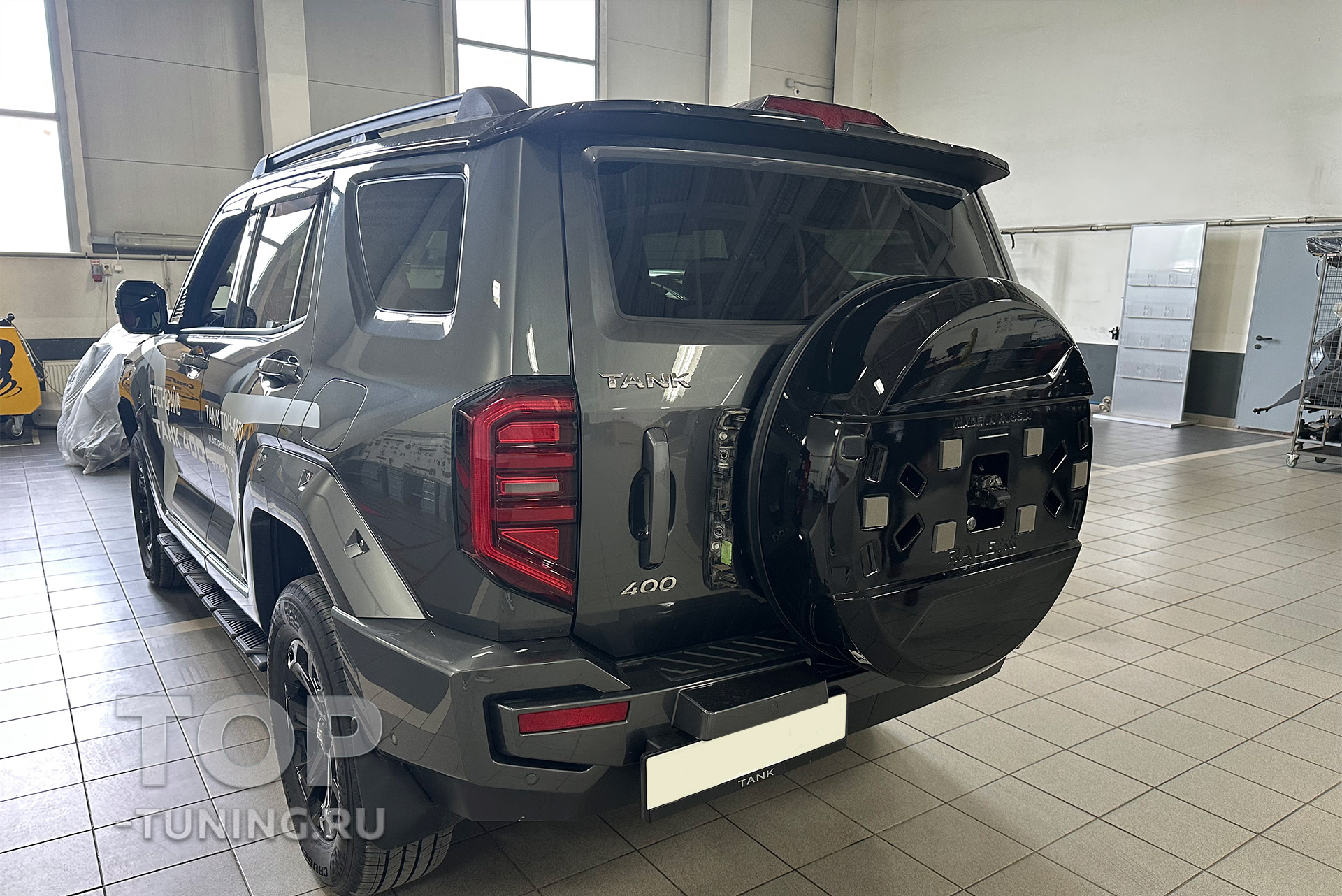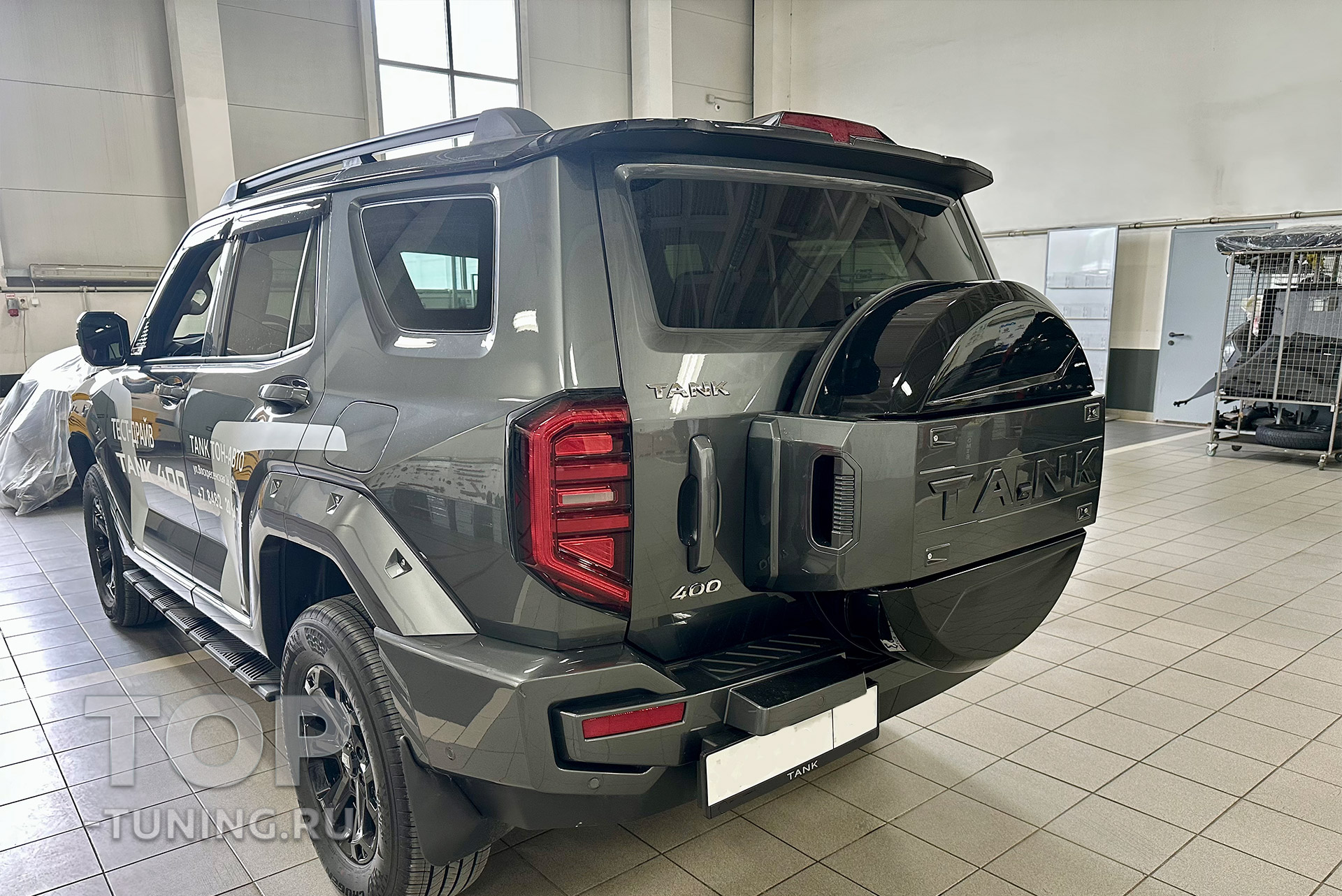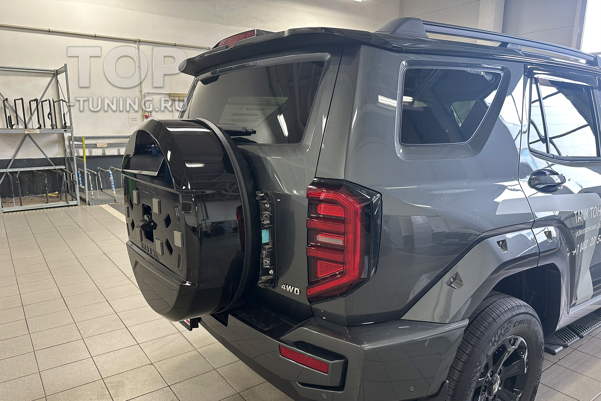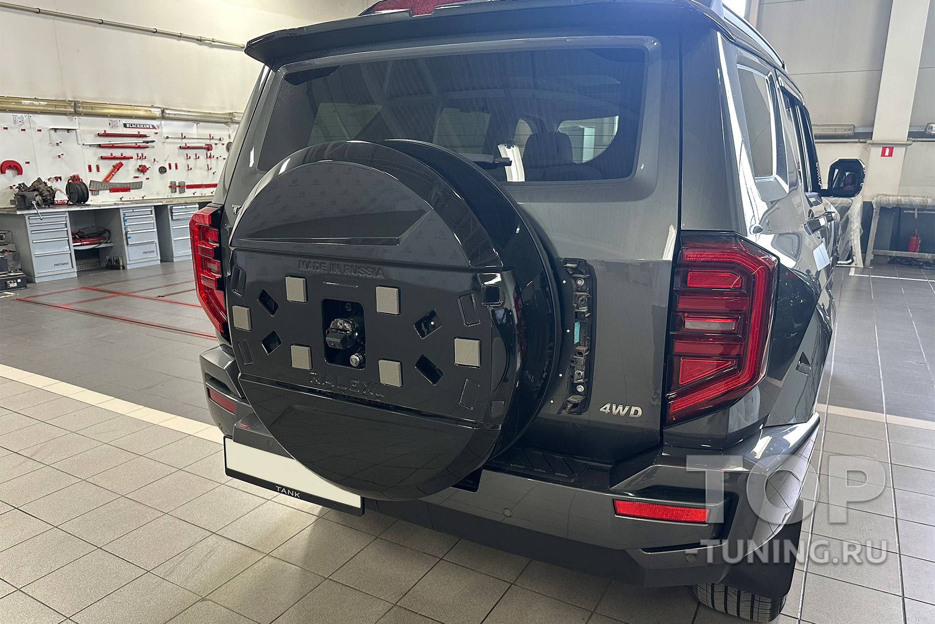 Чехол на запасное колесо для TANK 400, окрашенный в глубокий черный глянец, — это стильный и практичный аксессуар, созданный специально для защиты и украшения внедорожника. Он подчеркивает брутальный облик TANK 400 и придает задней части автомобиля завершенность и премиальный вид.