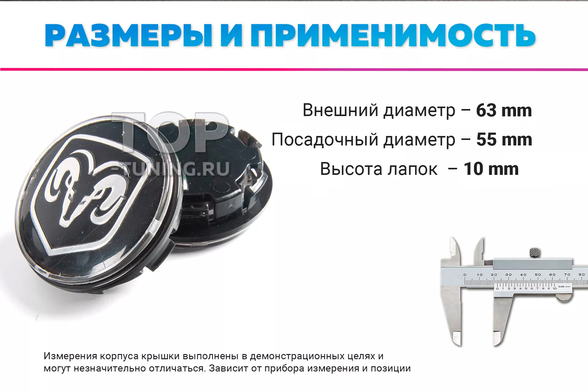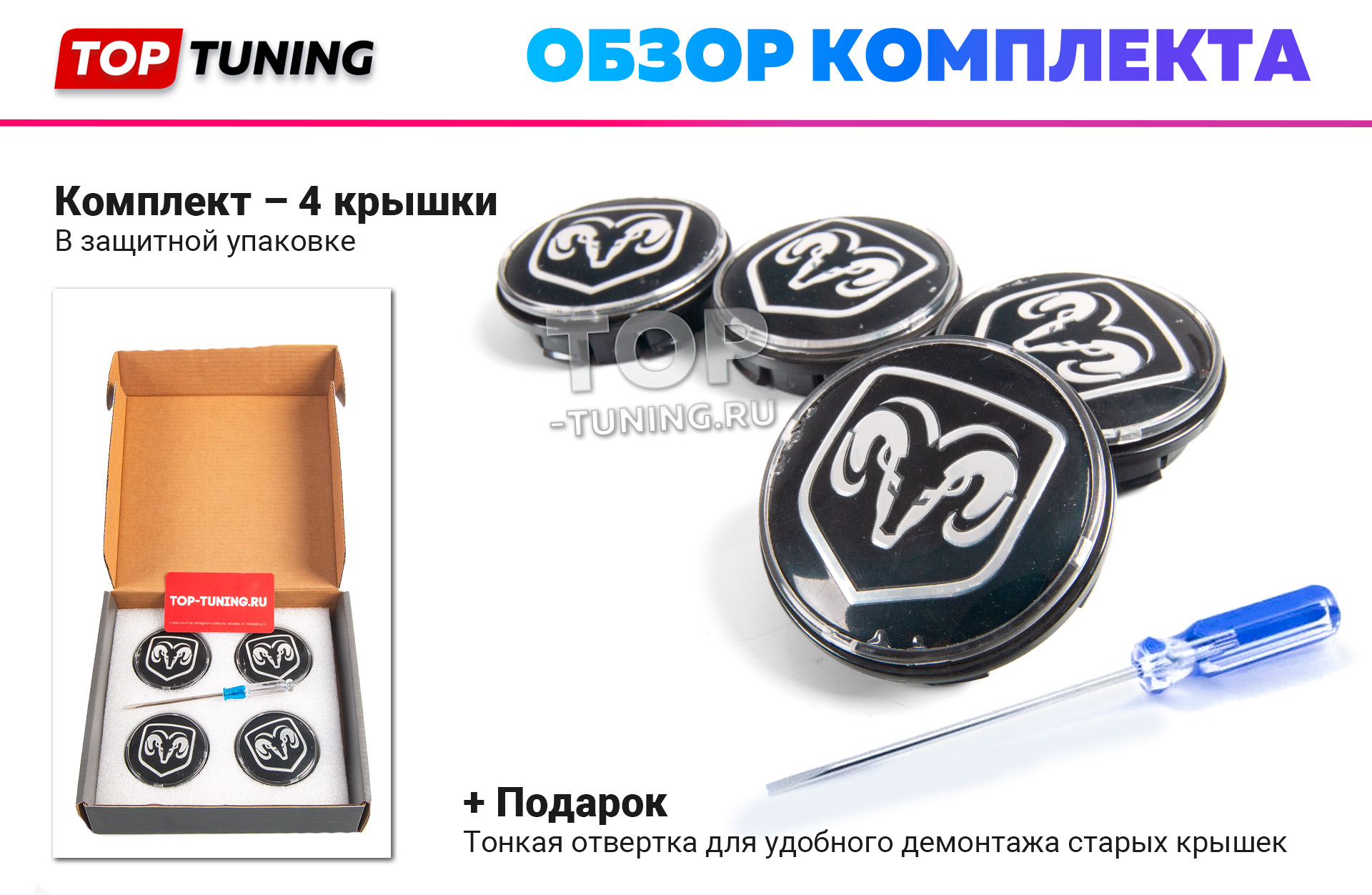 Набор подходит к оригинальным колесам Dodge. Перед покупкой потребуется замерить внешний диаметр штатной эмблемы, он должен быть равным 63 мм, внутренний диаметр должен быть 55 мм.