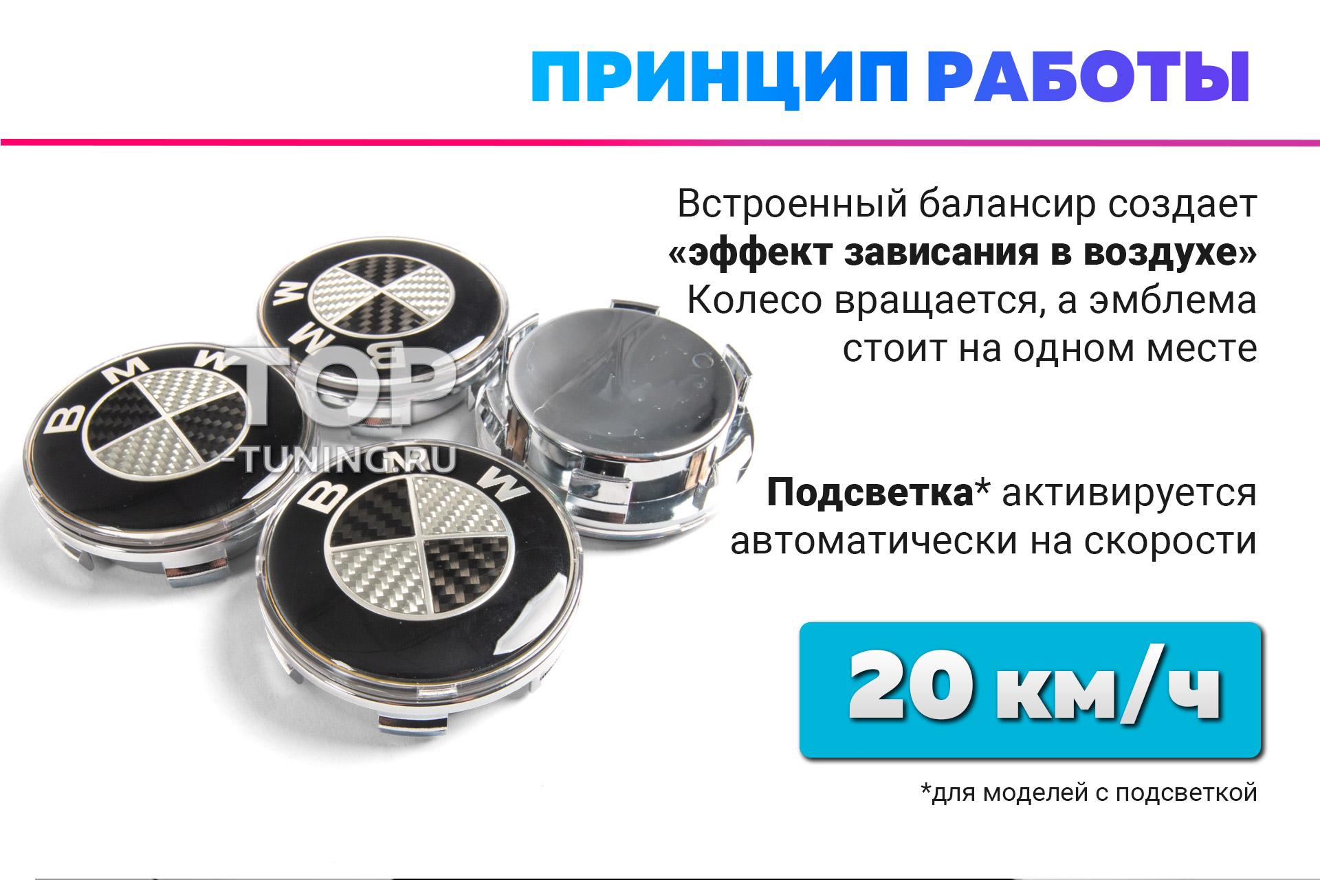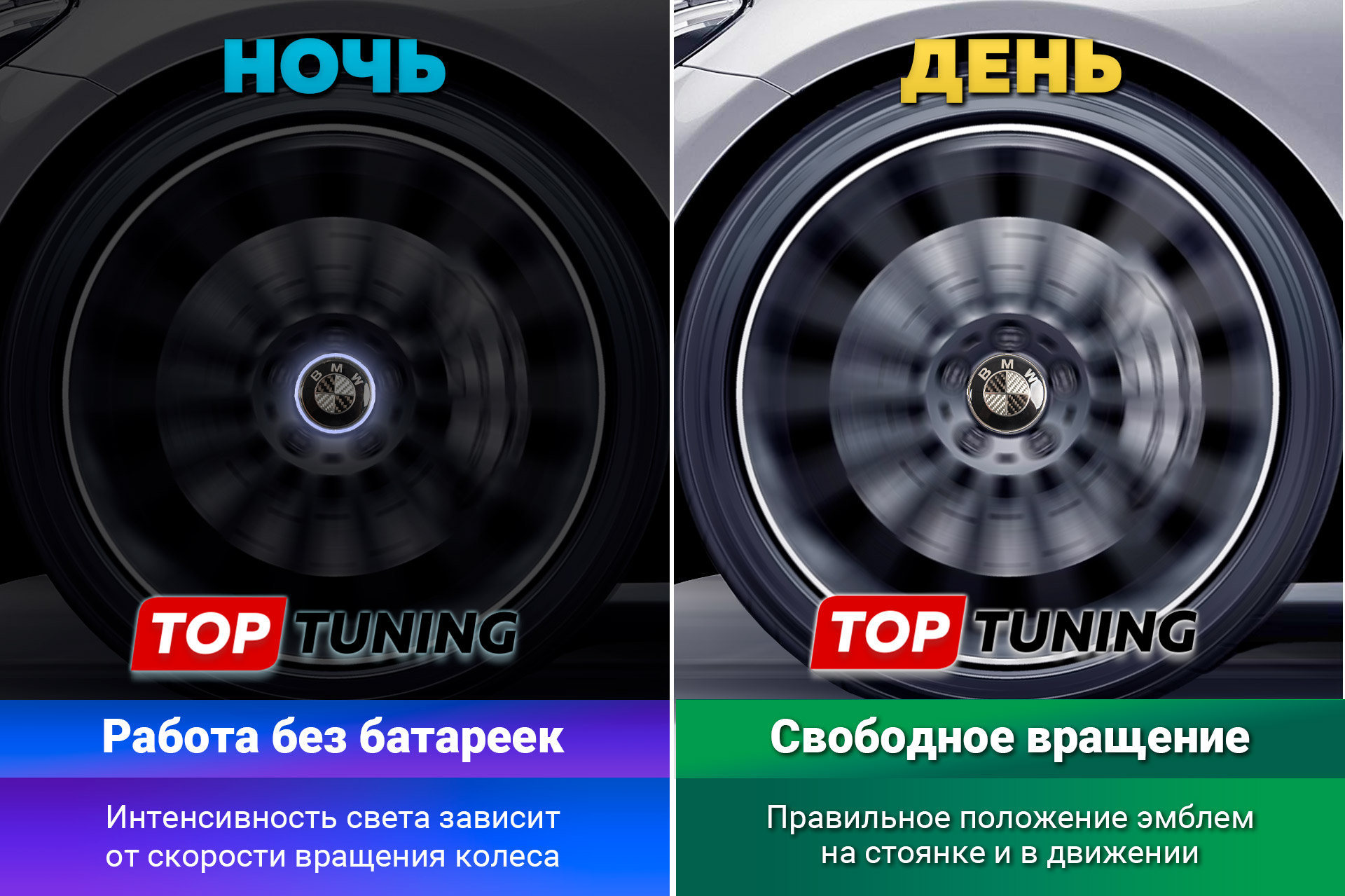 Чем выше скорость, тем ярче свечение эмблемы. Подсветка создает фоновое освещение центральной части колесного диска, что выглядит особенно привлекательно на отражающих поверхностях. Как только автомобиль остановился или скорость снизилась, подсветка выключится сама.