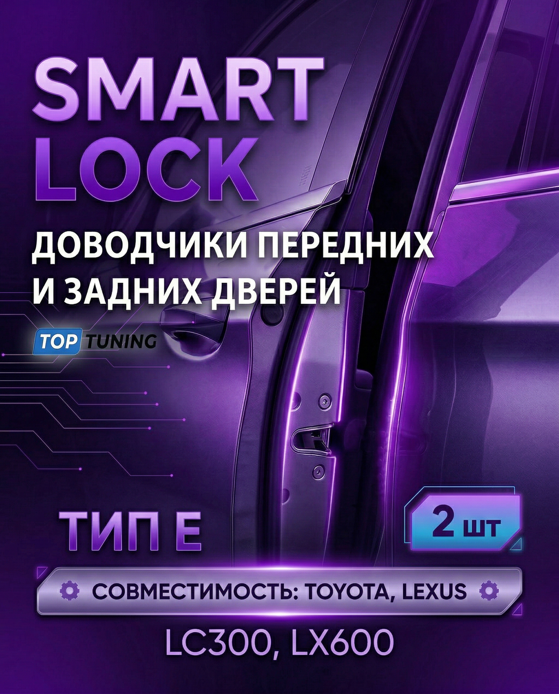 SMART LOCK Тип E — это современная безштыревая система электронных доводчиков дверей, разработанная специально для автомобилей Toyota Land Cruiser 300 и Lexus LX600 с учетом особенностей их штатных замков.