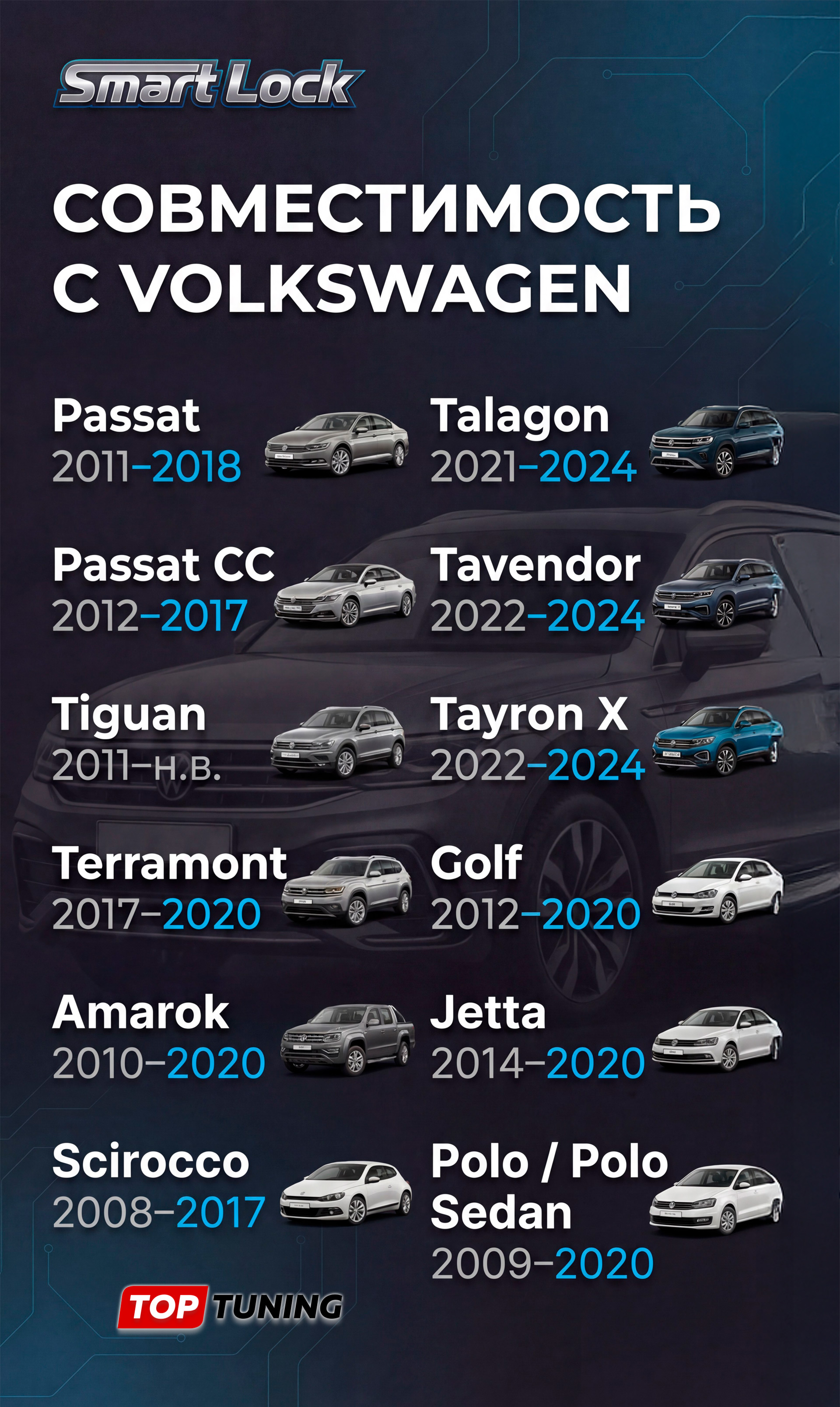Smart Lock — это система электродоводчиков нового поколения, созданная специально для автомобилей марки Volkswagen. Механизм мягко и бесшумно втягивает неплотно закрытую дверь, обеспечивая полное и надежное закрытие без усилий. Комплект не требует дилерской прошивки, не изменяет конструкцию автомобиля и полностью интегрируется в штатную архитектуру дверей.