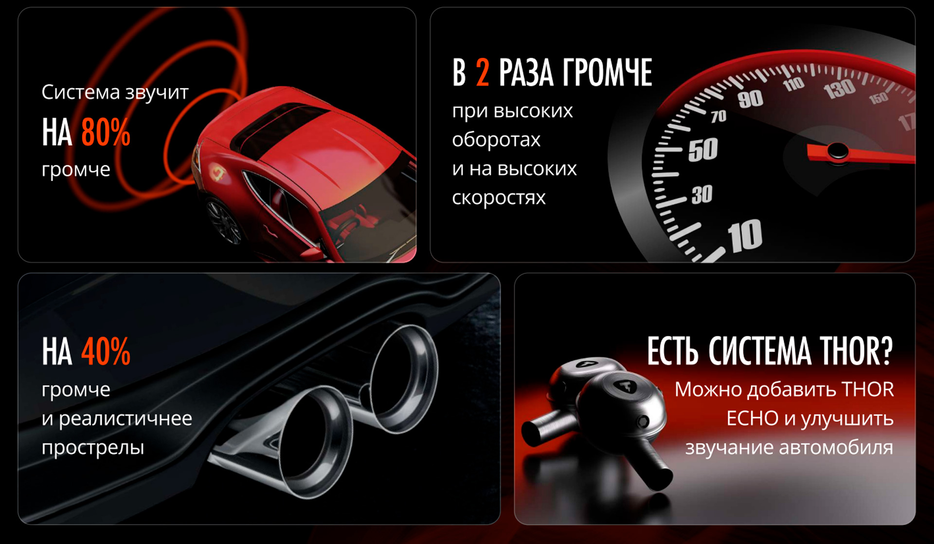 Система THOR постоянно обновляется и дополняется новыми схемами легендарных звуковых сцен. Пользователь каждый день может выбирать новую звуковую сцену под настроение, это могут быть Mercedes AMG C63, Mercedes AMG S63, Mercedes Gelandewagen 63, Porsche Panamera, Ferrari 488 GTB, BMW M4, Nissan GTR, реактивный самолет Jet Finger и многие другие.