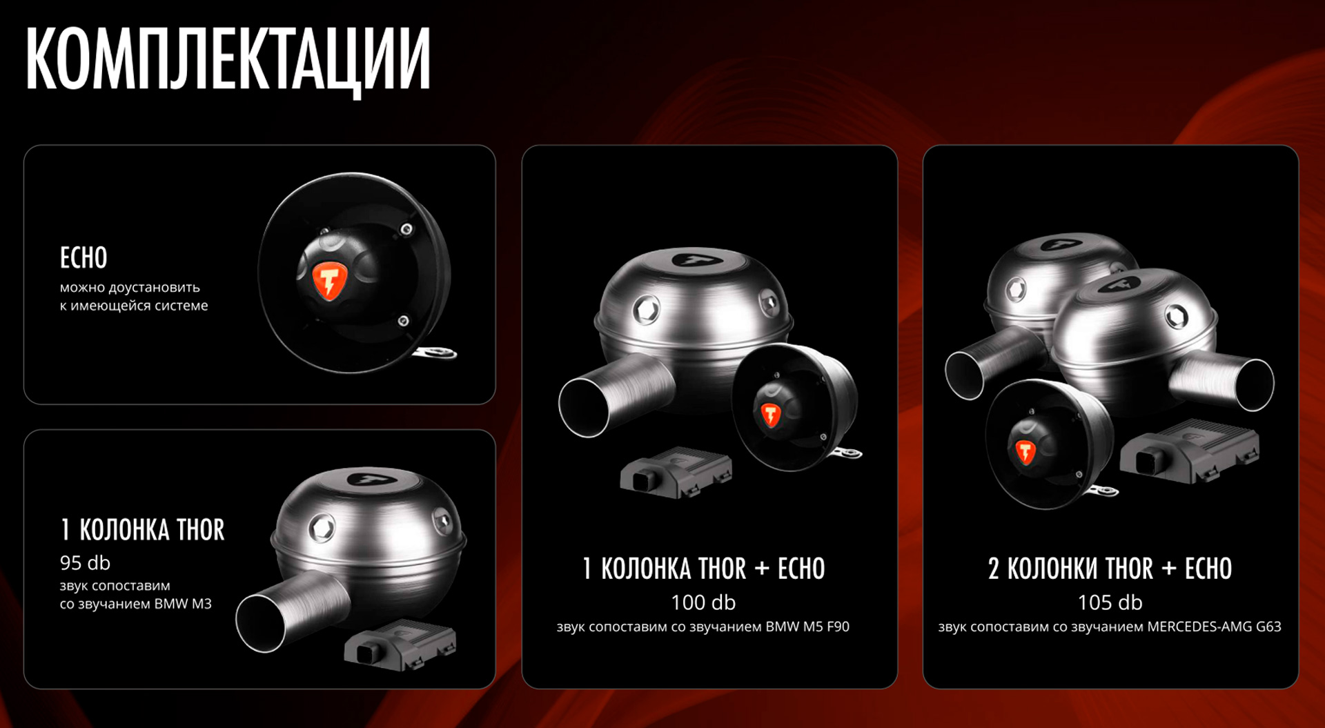 Система THOR постоянно обновляется и дополняется новыми схемами легендарных звуковых сцен. Пользователь каждый день может выбирать новую звуковую сцену под настроение, это могут быть Mercedes AMG C63, Mercedes AMG S63, Mercedes Gelandewagen 63, Porsche Panamera, Ferrari 488 GTB, BMW M4, Nissan GTR, реактивный самолет Jet Finger и многие другие.