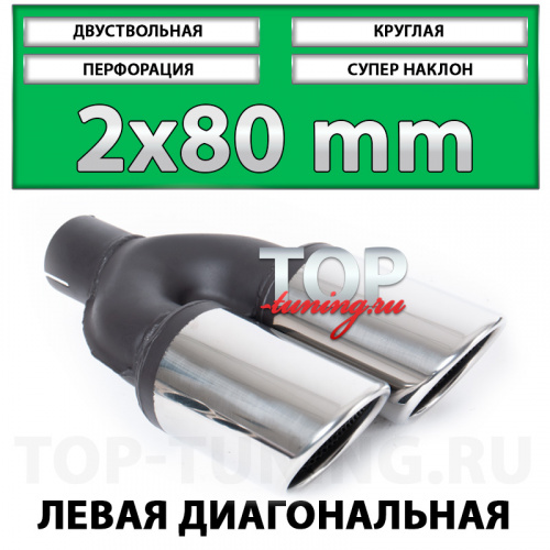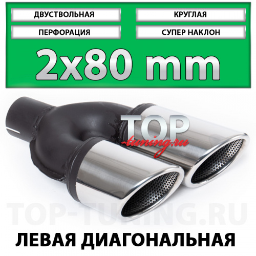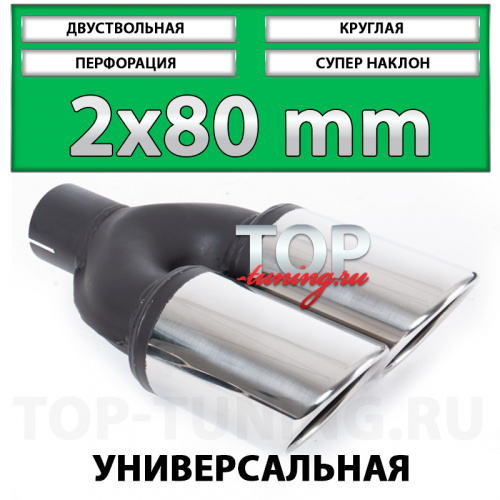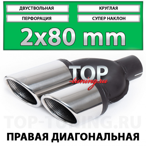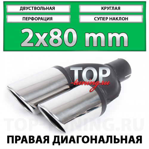 Двуствольные насадки Revolt 80mm - популярное решение для установки в тюнинг обвесы для небольших седанов, хэтчбеков или универсалов, таких как: Opel Astra, Honda Civic, Accord, BMW 3 и 5 серии, Audi A4 и других, подходящих по монтажным габаритам автомобилям оснащенными обвесами с выходами под насадки, такими как: MUGEN, ABT, AMG, SCHNITZER и т.д. Одни из самых компактных по размерам насадки диаметром 80 миллиметров наиболее популярны при модернизации большинства выхлопных систем и подходят почти любому автомобилю с посадочной шириной выхлопных ёмкостей от 170 мм. Дополнительным преимуществом серии 80 мм. является наличие вариантов с диагональным расположением патрубков, что наиболее удачно выглядит на радиусных, округлых бамперах, где требуется разный вылет труб.