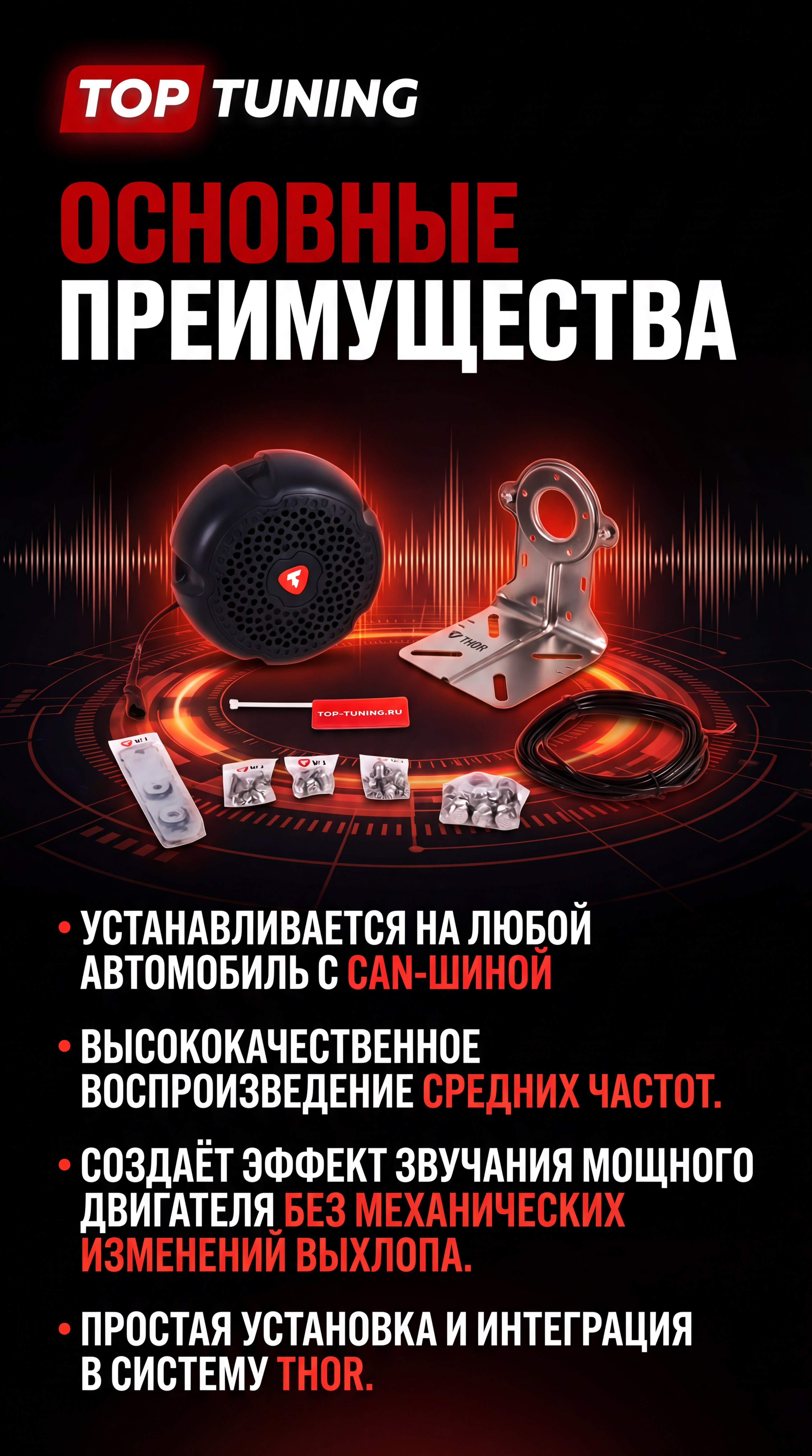 Динамик предназначен для работы в составе фирменной экосистемы THOR и подключается к электронному блоку управления THOR (приобретается отдельно). Для достижения максимально реалистичного и объемного звучания, близкого к работе настоящего спортивного выхлопа, производитель рекомендует использовать THOR Storm в комбинации с: