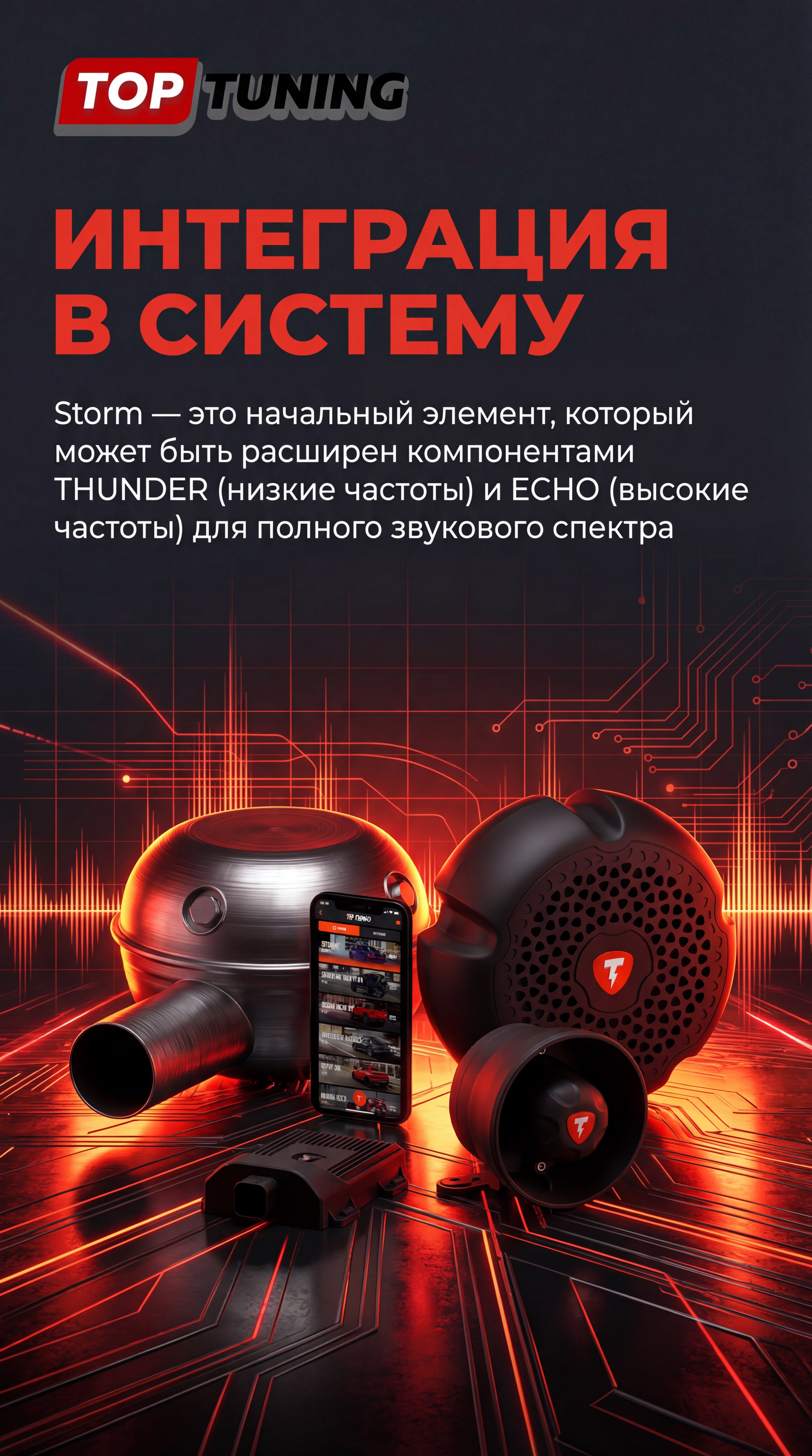 Storm отвечает за воспроизведение средних частот, которые формируют «тело» и насыщенность звука. Именно этот диапазон отвечает за узнаваемый характер двигателя и его динамику при разгоне. Для получения максимально реалистичного звучания Storm рекомендуется комбинировать с другими компонентами системы THOR.