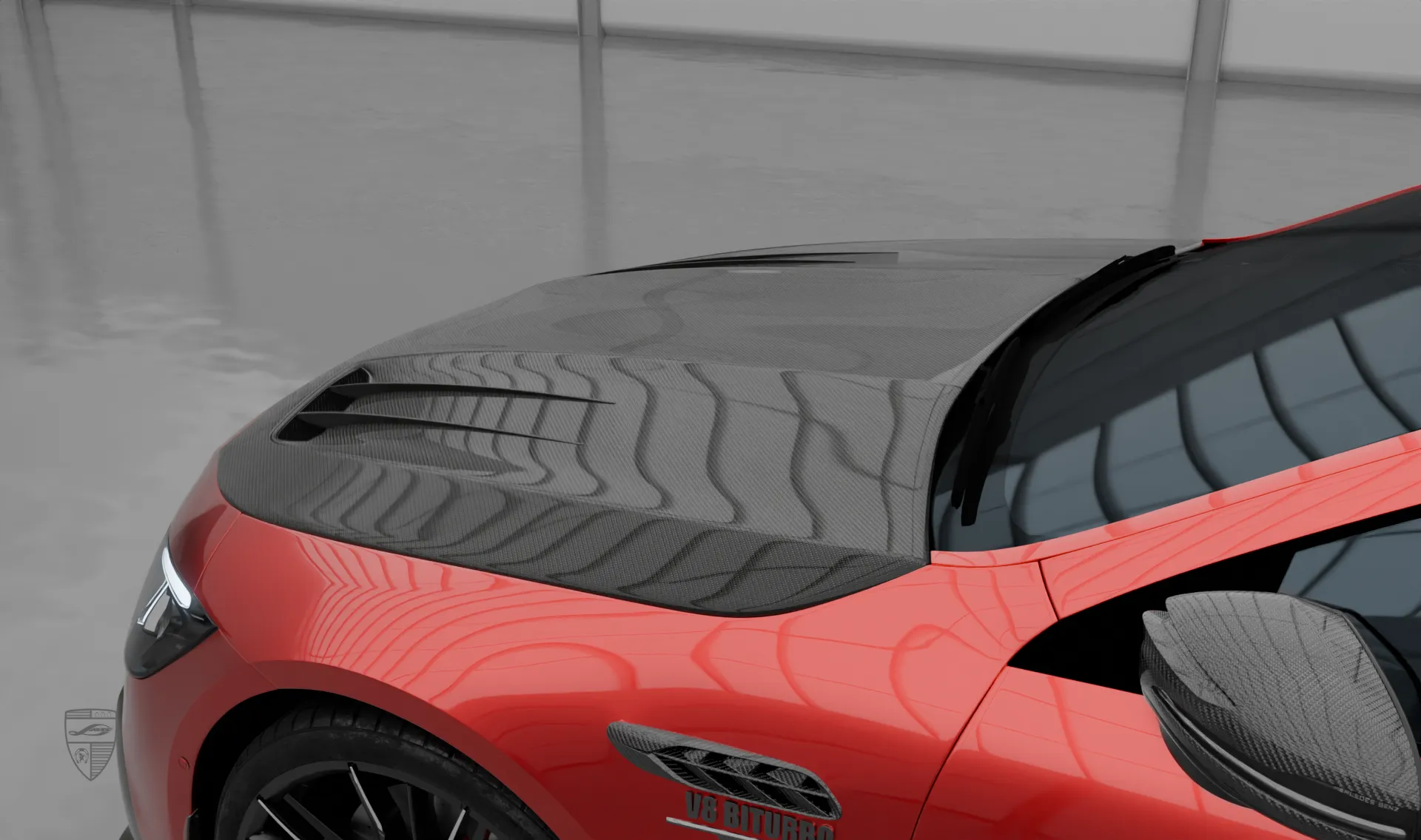 Деталь объединяет сложную скульптурную геометрию и современные материалы. Использование 100% натурального карбонового волокна или композитного окрашенного базальта позволяет получить точные формы, высокую прочность и премиальное качество поверхности. Капот создавался с учетом оригинального дизайна AMG GT 63 и интегрируется в архитектуру кузова.