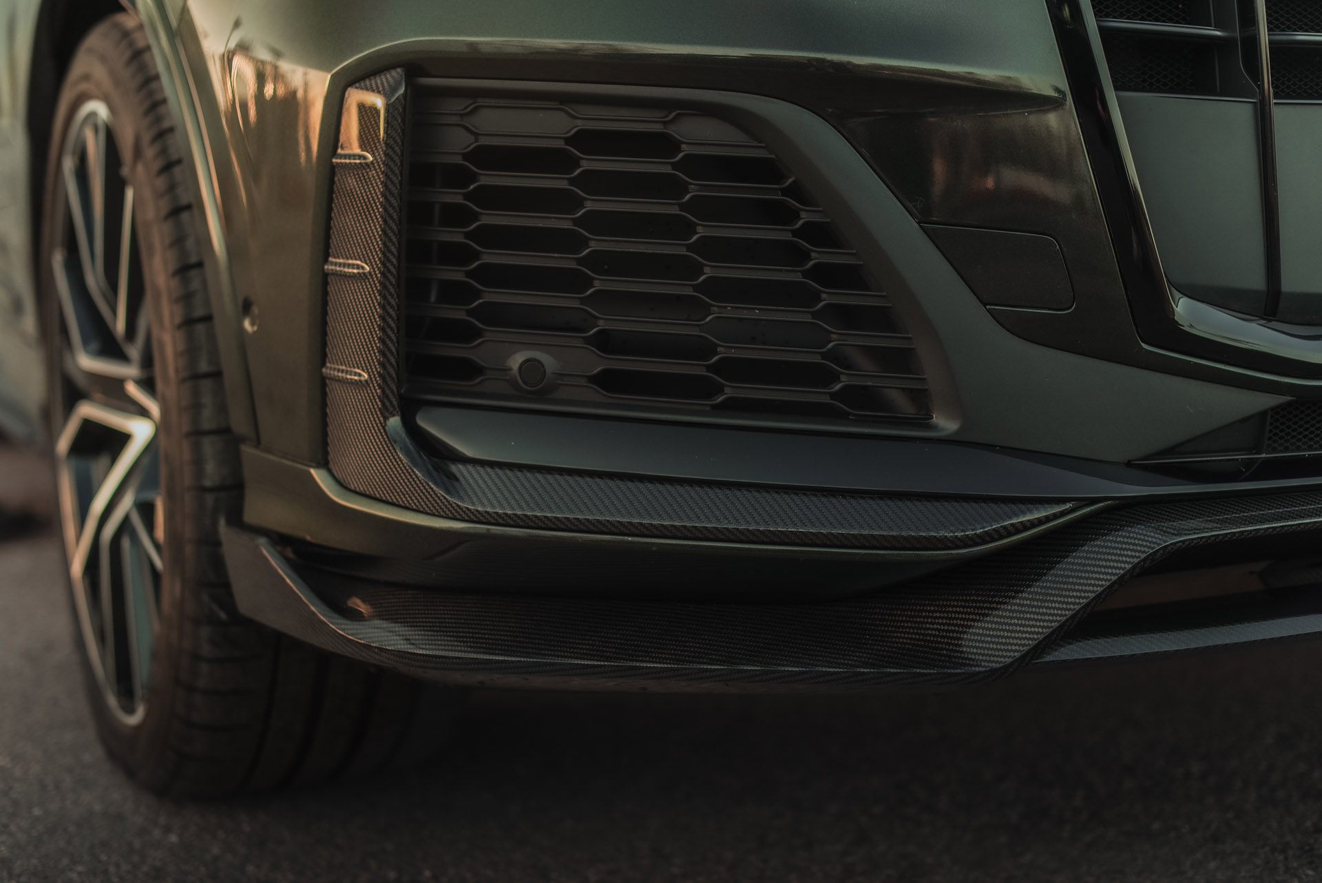 Карбоновые накладки воздуховодов переднего бампера MTR Design — акцентный элемент тюнинга для Audi Q7 в кузове 4M (рестайлинг). Детали устанавливаются в зоны боковых воздухозаборников переднего бампера, усиливая визуальную глубину и проработку передней части автомобиля.