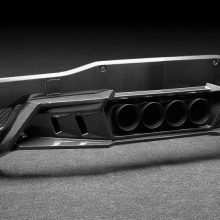 Сзади изменения становятся еще более заметными. Диффузор с интегрированной выхлопной системой придает автомобилю динамичный облик, а антикрыло завершает образ высокопроизводительного суперкара. Накладки на крышку багажника и дверные ручки добавляют детализацию и эксклюзивность.