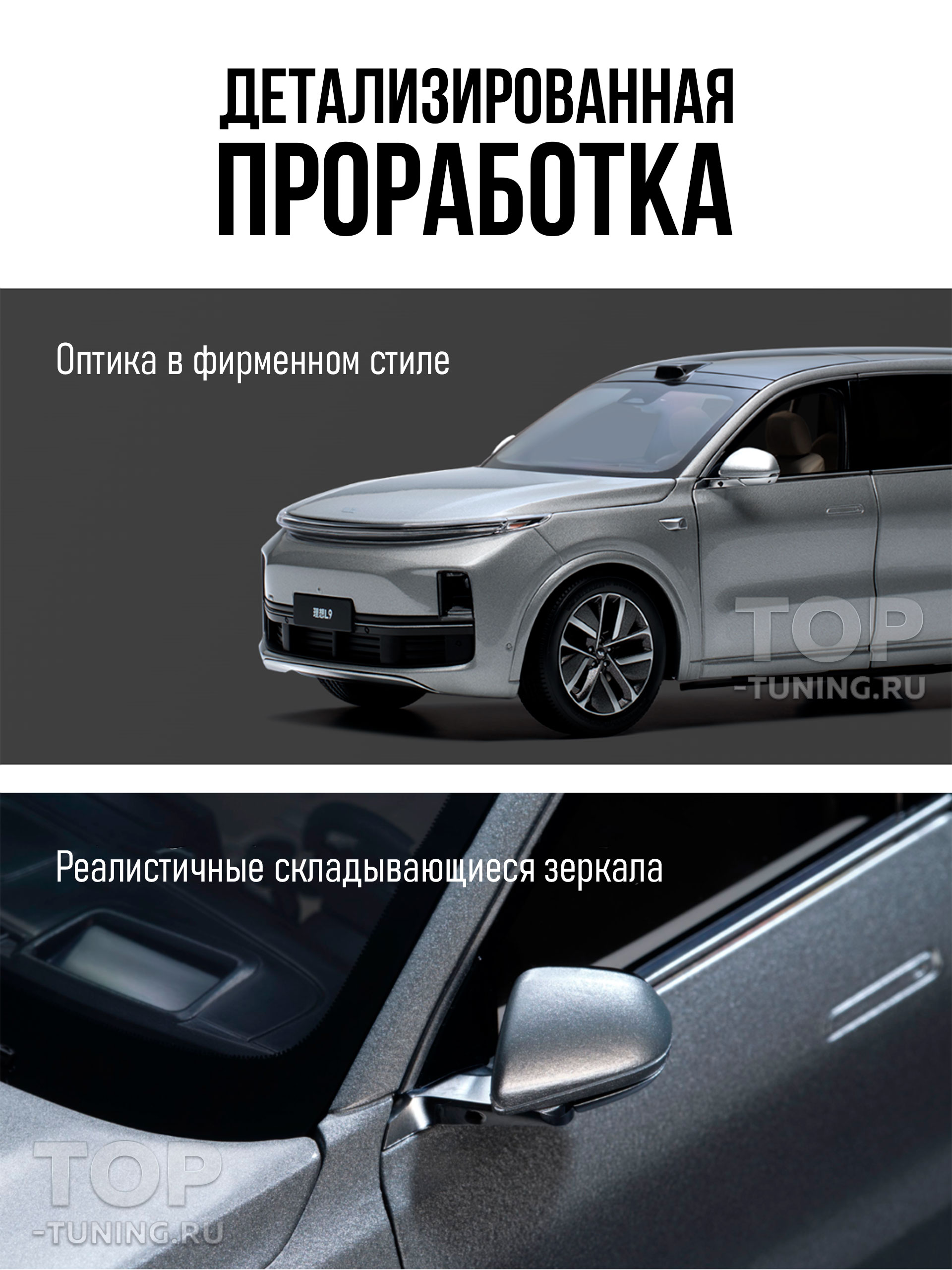 Корпус выполнен из импортного сплава и ABS-пластика. Высокоточное литьё обеспечивает прочность и стойкость к деформациям. Покраска выполнена в формате «360°» — равномерное нанесение слоёв с сохранением блеска и глубины оригинальной окраски Lixiang L9. Все покрытия соответствуют международным стандартам безопасности.